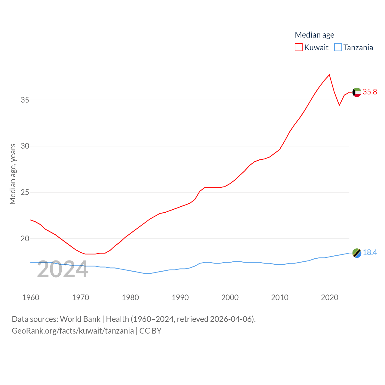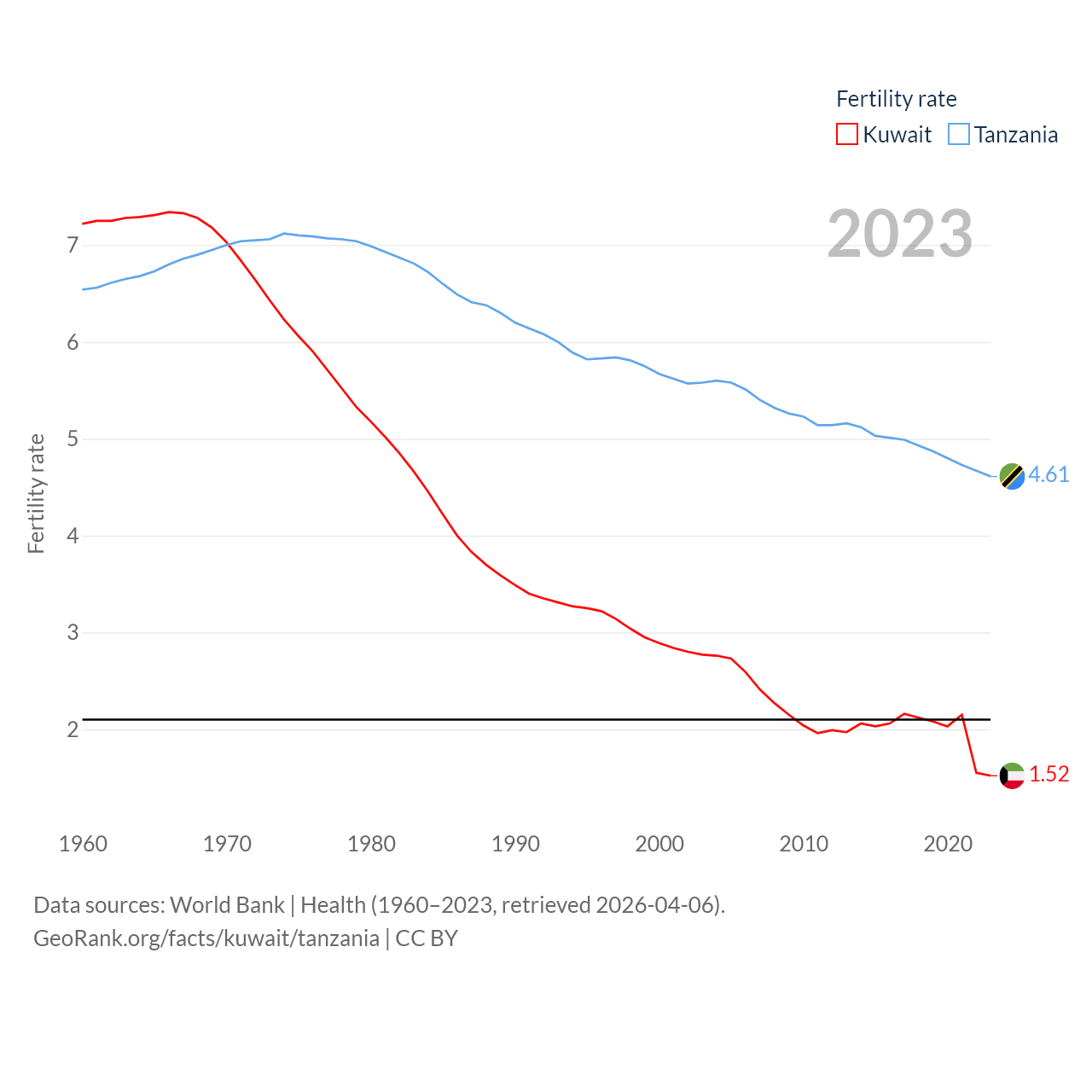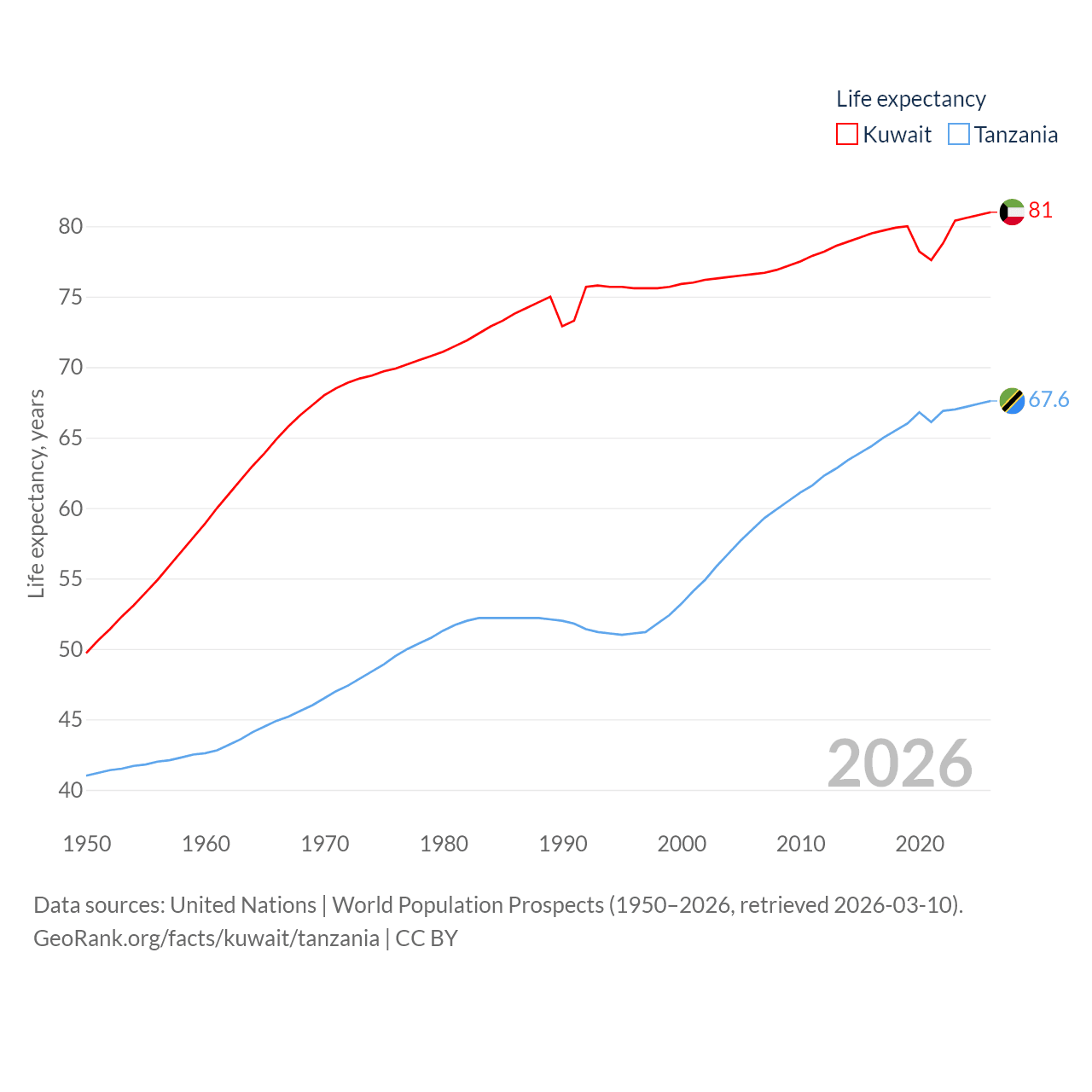 Kuwait has a population of 4.9M (ranked 127/197), compared with 68.6M in Tanzania (ranked 22/197). Kuwait's land area is 6,880 sq mi versus 342,009 sq mi for Tanzania (ranked 153rd vs. 31st).