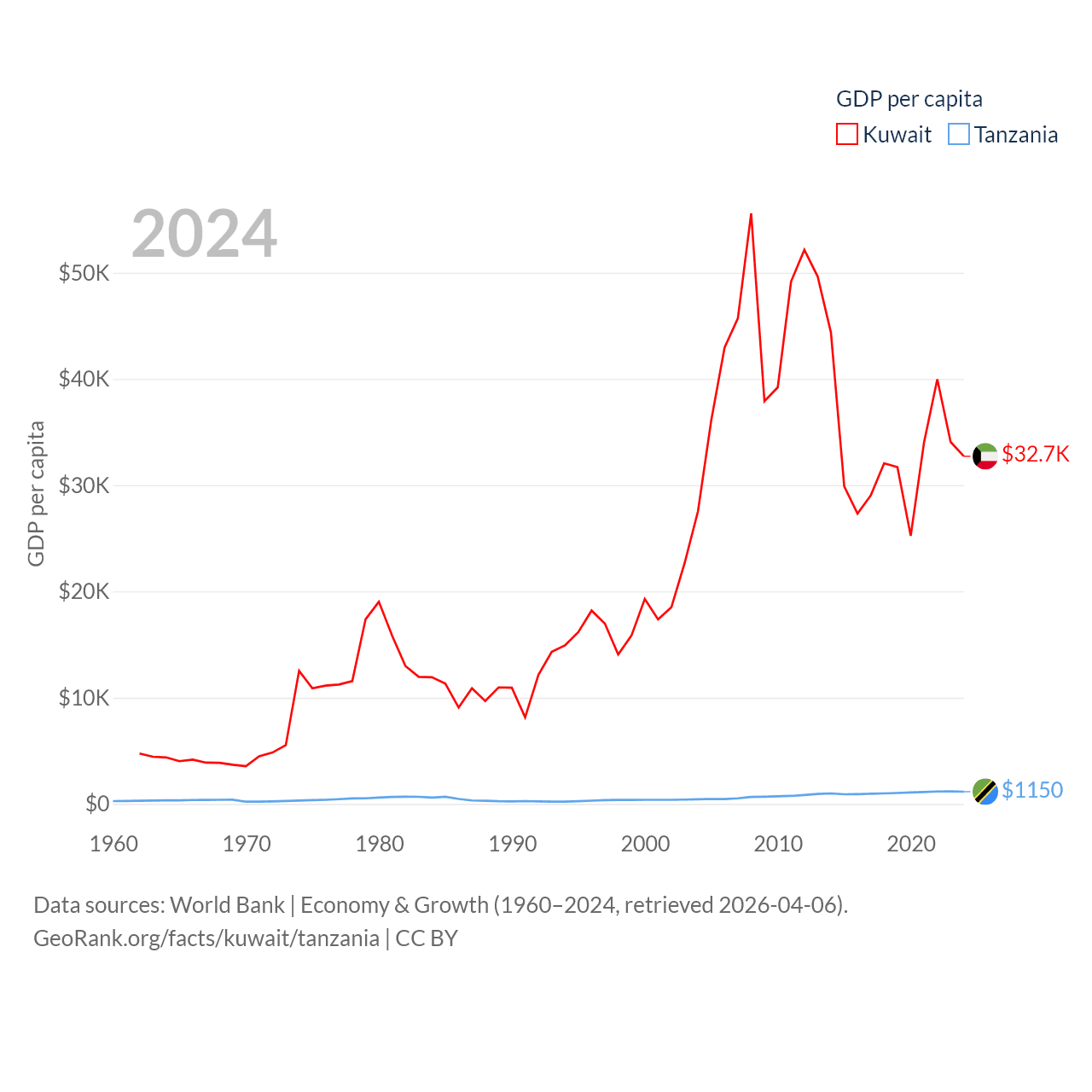 By GDP, Kuwait ranks 59/197 ($160B) and Tanzania ranks 82/197 ($78.8B). By GDP per capita, Kuwait ranks 37/197 ($32,718), while Tanzania ranks 170/197 ($1,150).