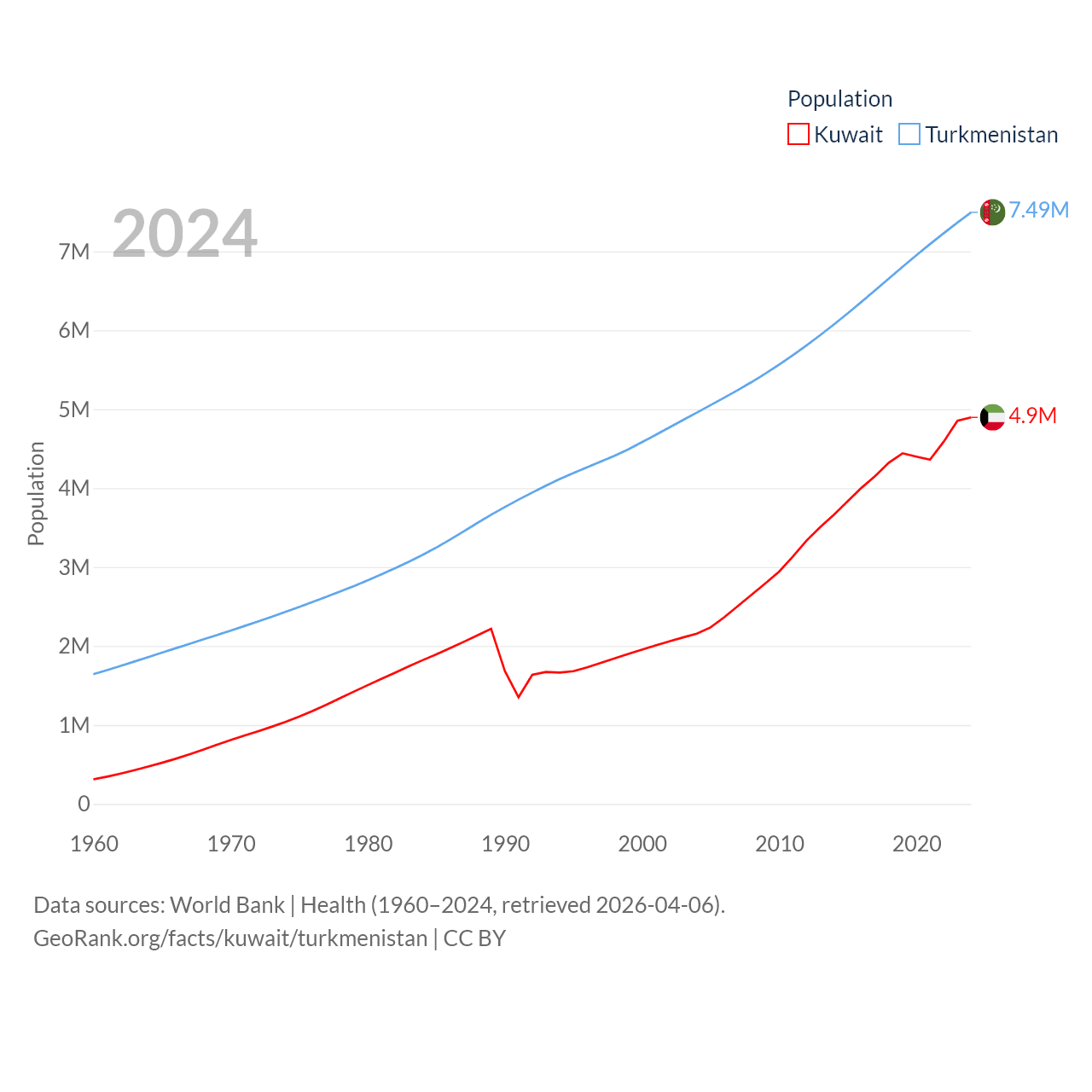 Kuwait has a population of 4.9M (ranked 127/197), compared with 7.49M in Turkmenistan (ranked 104/197). Kuwait's land area is 6,880 sq mi versus 181,441 sq mi for Turkmenistan (ranked 153rd vs. 53rd).