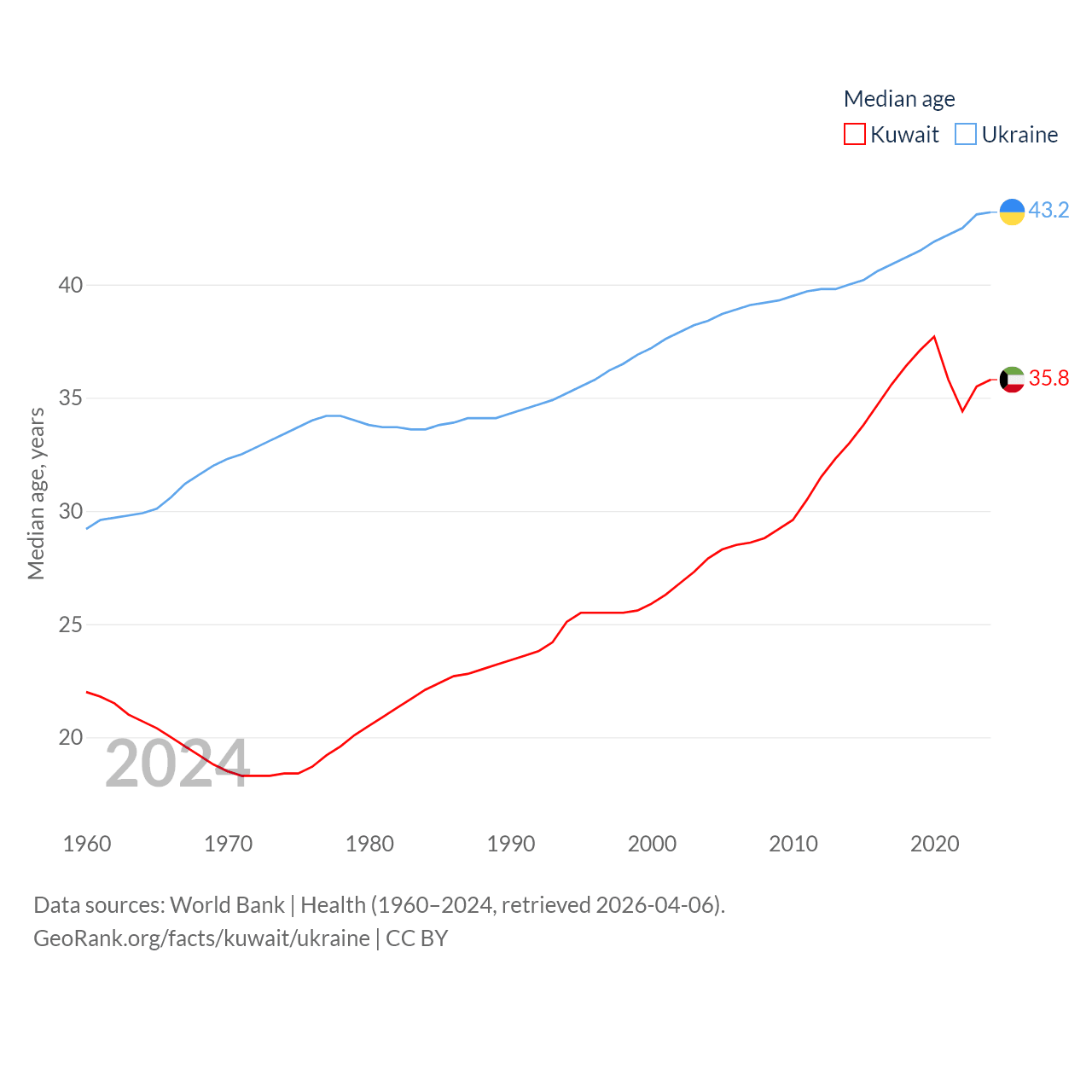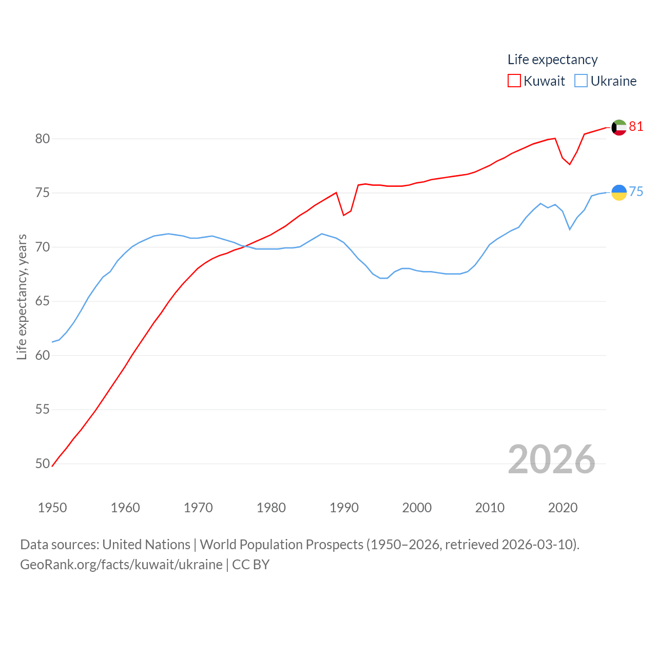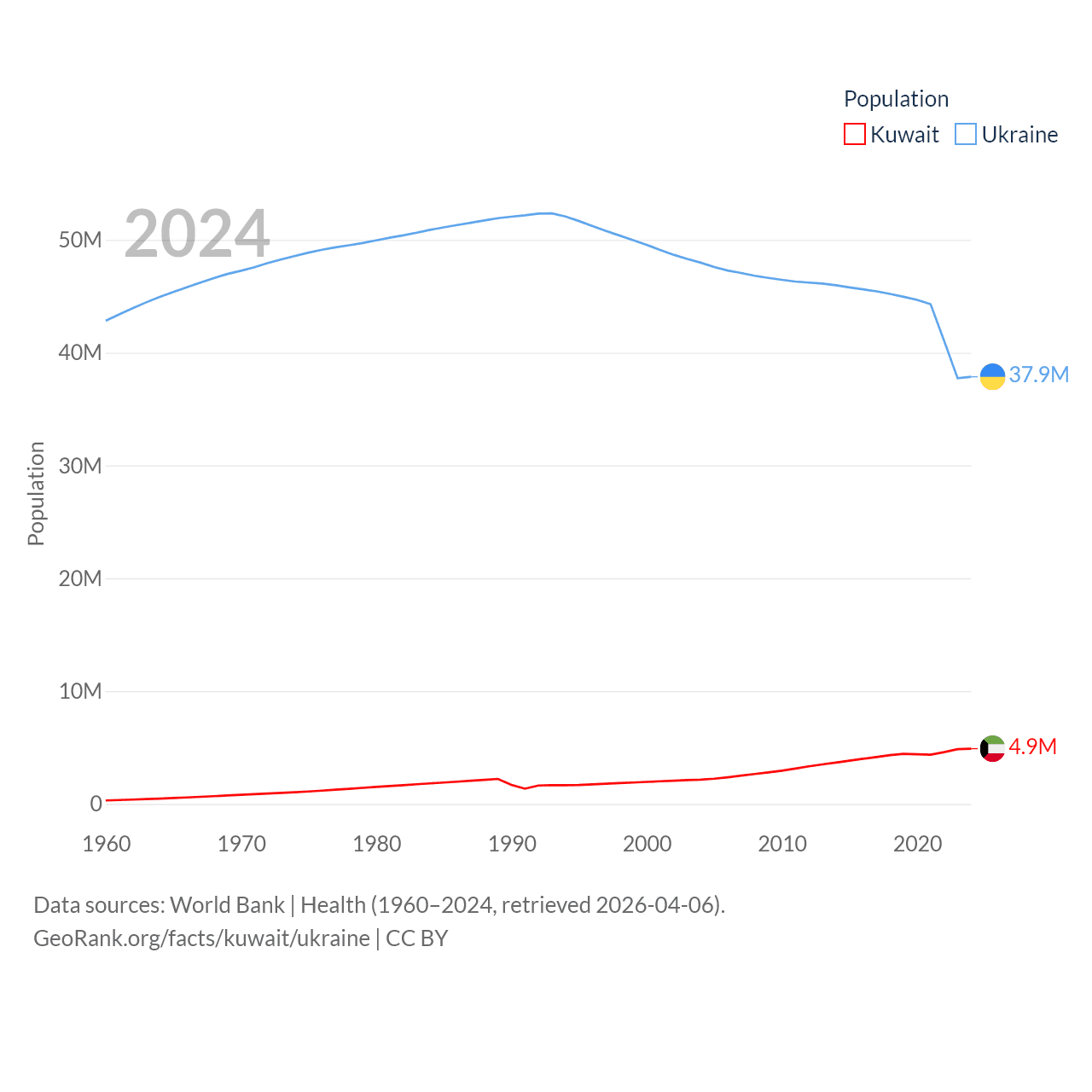 Kuwait has a population of 4.9M (ranked 127/197), compared with 37.9M in Ukraine (ranked 41/197). Kuwait's land area is 6,880 sq mi versus 223,708 sq mi for Ukraine (ranked 153rd vs. 46th).
