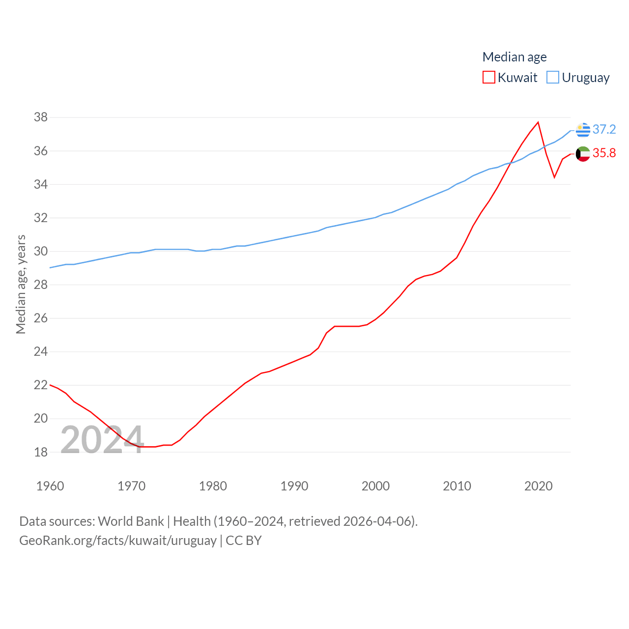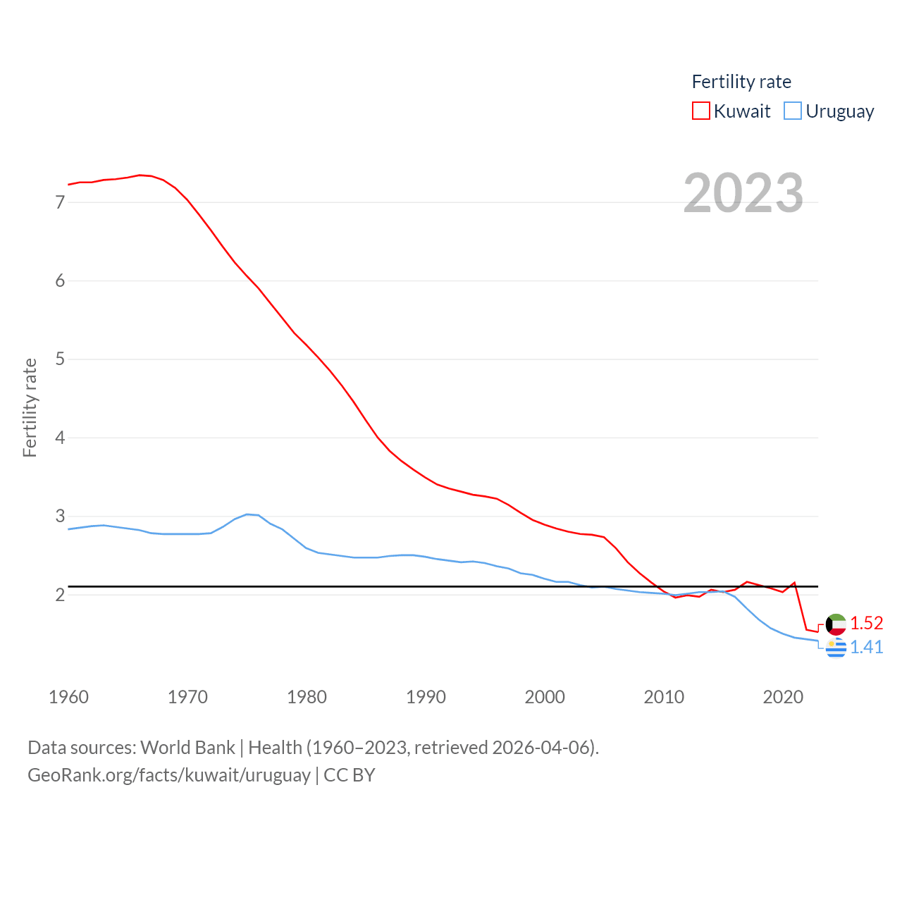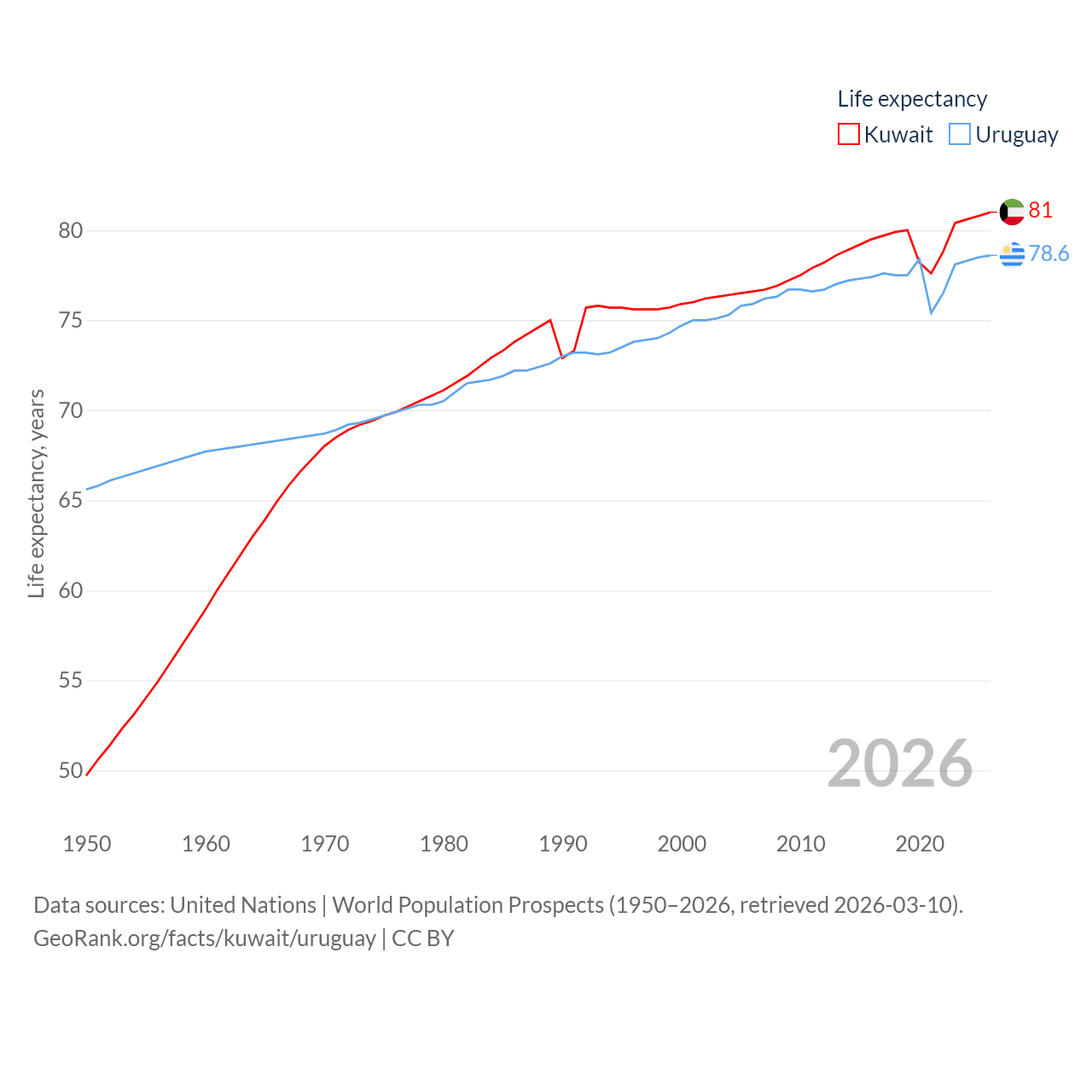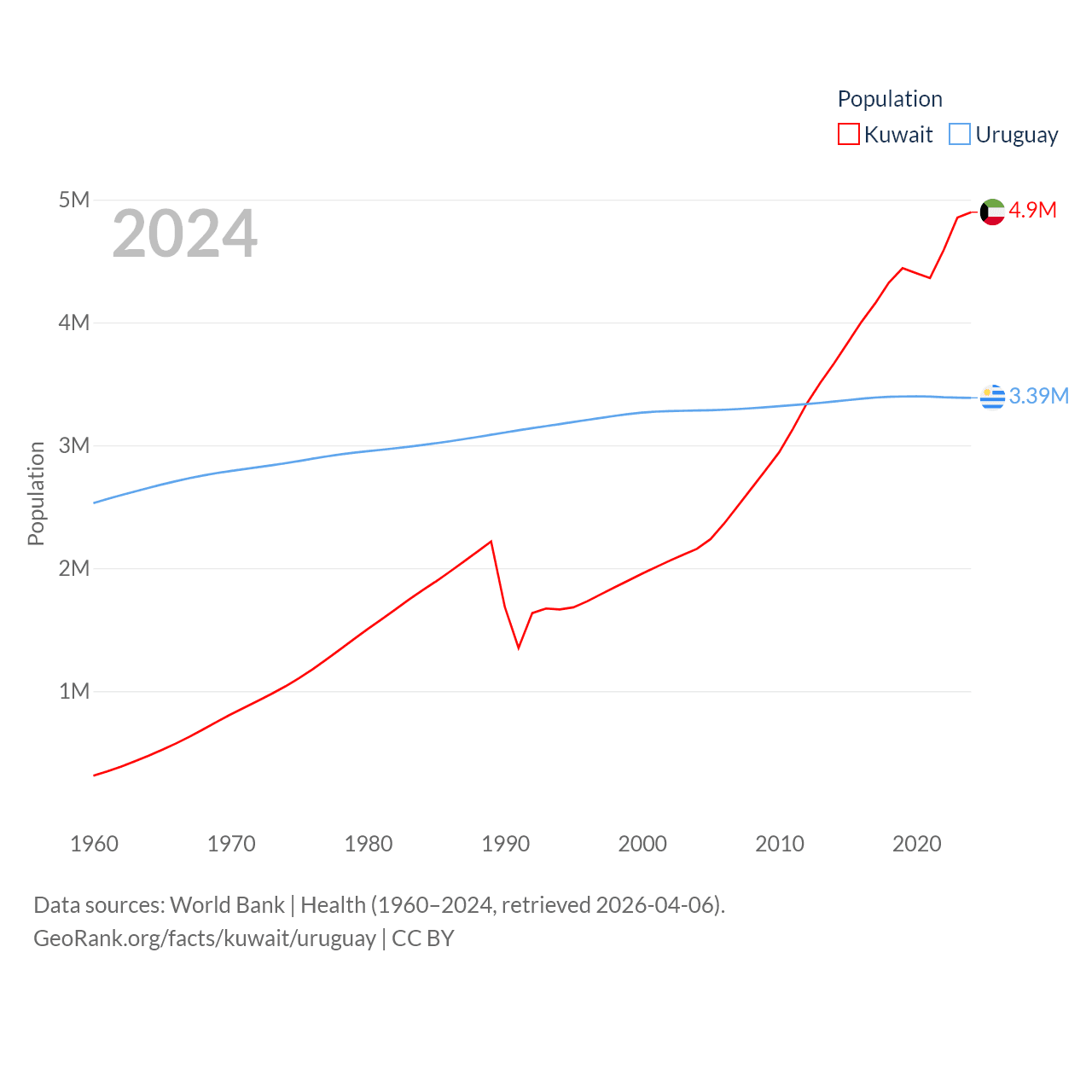 Kuwait has a population of 4.9M (ranked 127/197), compared with 3.39M in Uruguay (ranked 133/197). Kuwait's land area is 6,880 sq mi versus 67,576 sq mi for Uruguay (ranked 153rd vs. 89th).
