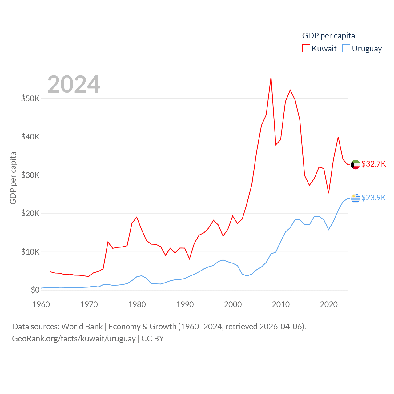 By GDP, Kuwait ranks 59/197 ($160B) and Uruguay ranks 81/197 ($81B). By GDP per capita, Kuwait ranks 37/197 ($32,718), while Uruguay ranks 52/197 ($23,907).