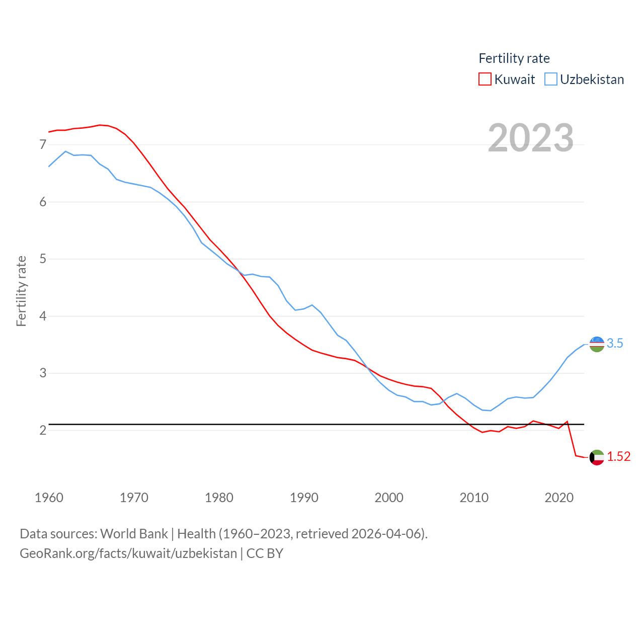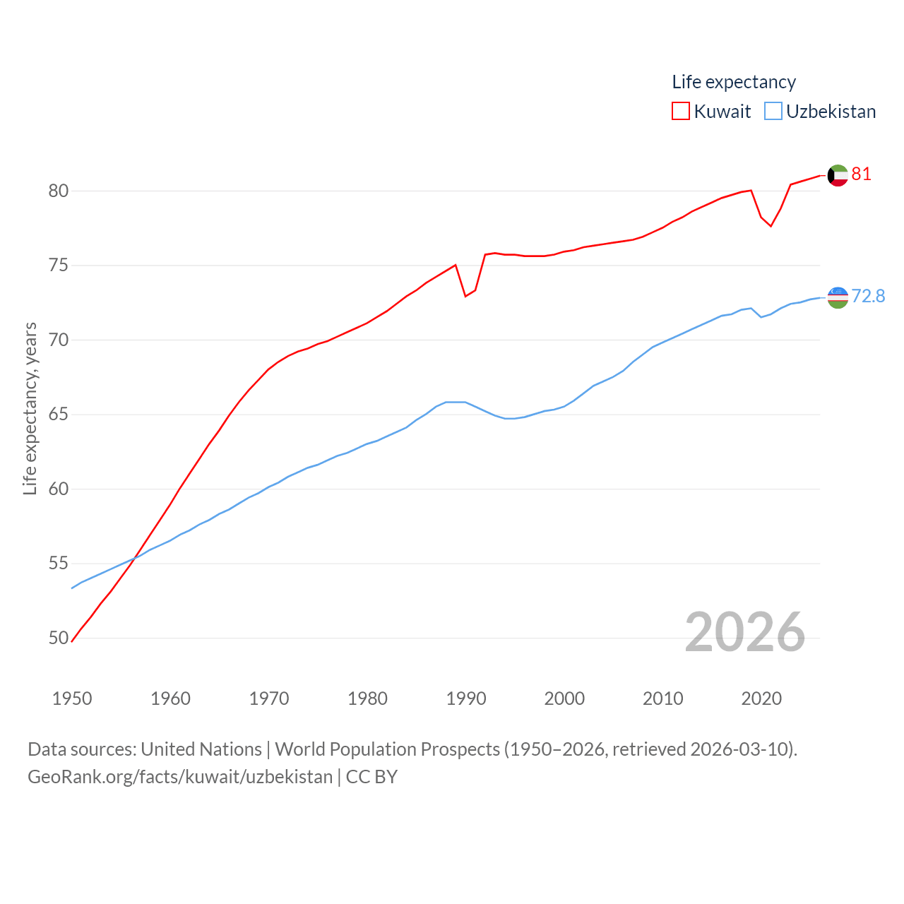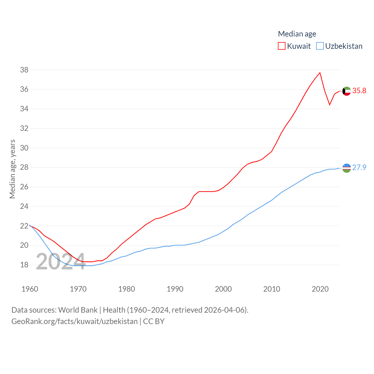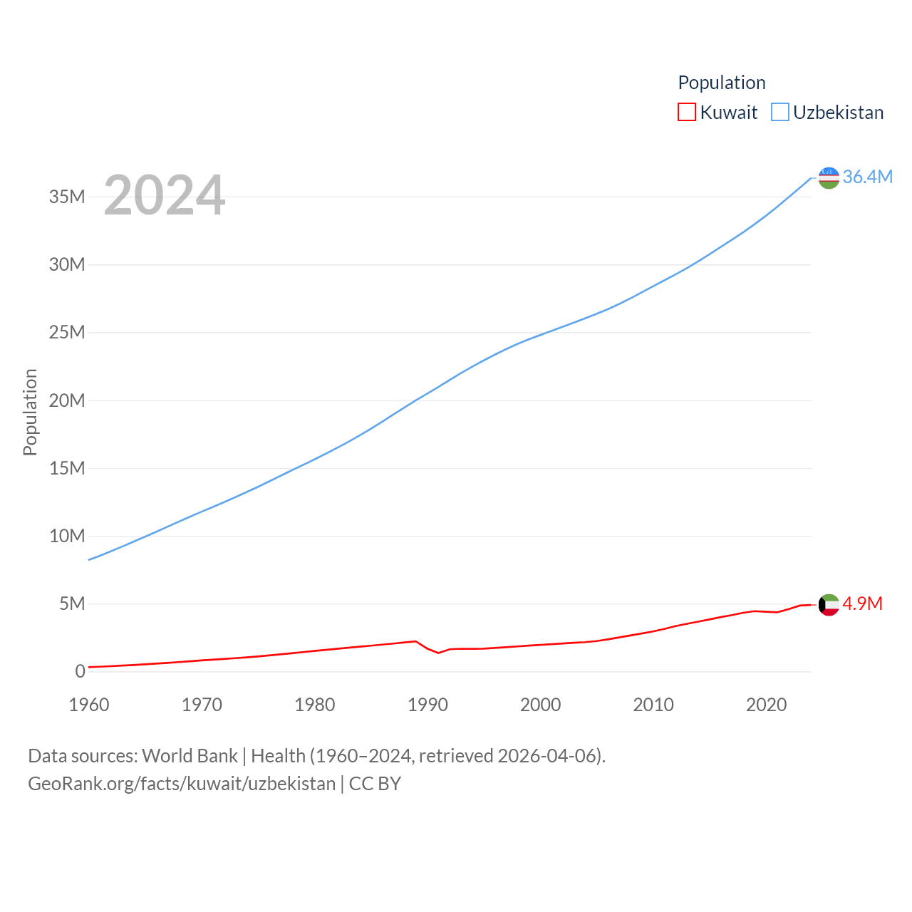 Kuwait has a population of 4.9M (ranked 127/197), compared with 36.4M in Uzbekistan (ranked 43/197). Kuwait's land area is 6,880 sq mi versus 170,136 sq mi for Uzbekistan (ranked 153rd vs. 56th).