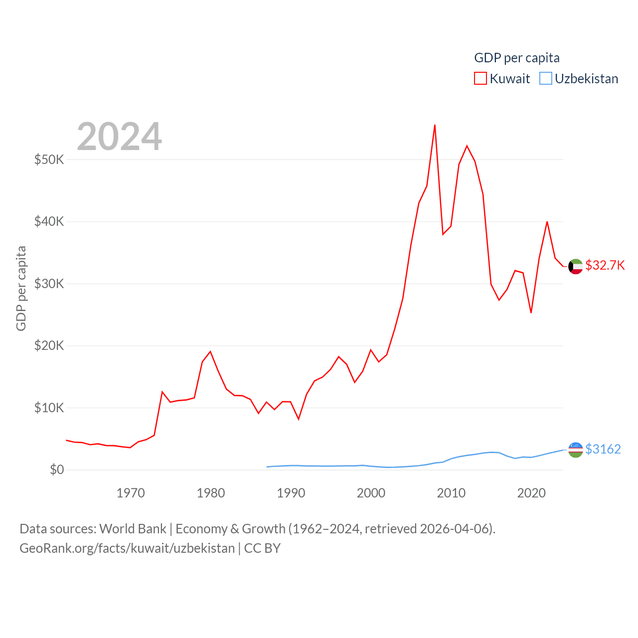 By GDP, Kuwait ranks 59/197 ($160B) and Uzbekistan ranks 66/197 ($115B). By GDP per capita, Kuwait ranks 37/197 ($32,718), while Uzbekistan ranks 139/197 ($3,162).