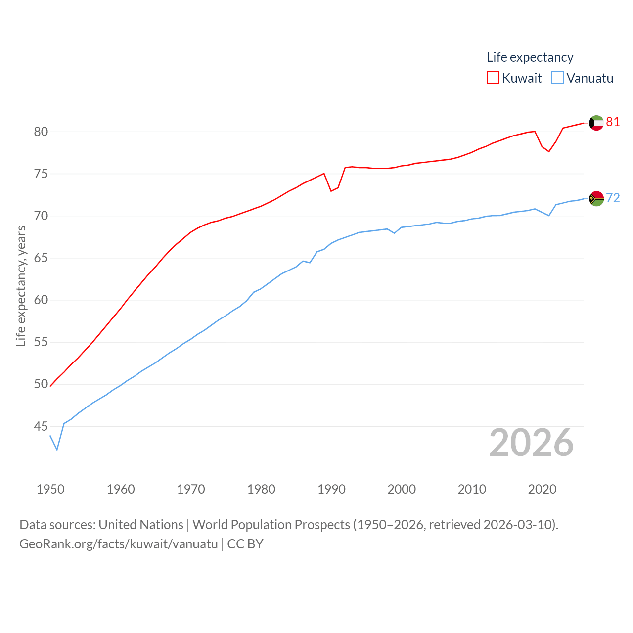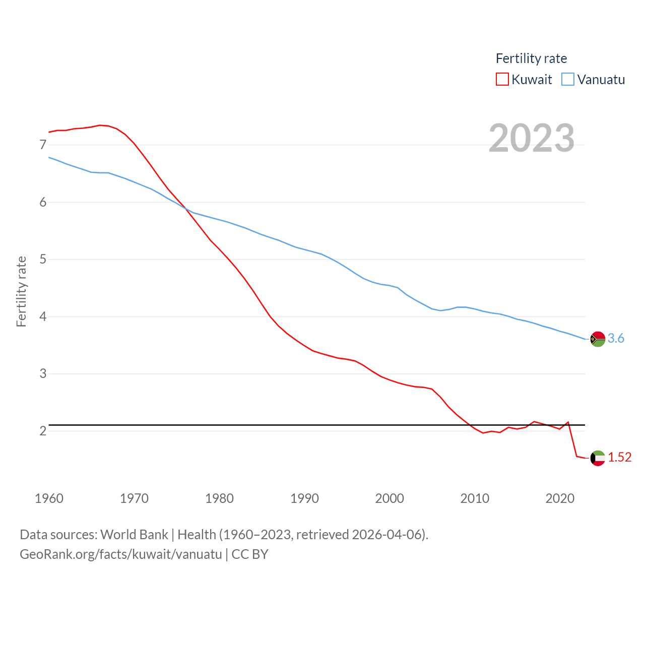 Kuwait has a population of 4.9M (ranked 127/197), compared with 328K in Vanuatu (ranked 174/197). Kuwait's land area is 6,880 sq mi versus 4,707 sq mi for Vanuatu (ranked 153rd vs. 157th).