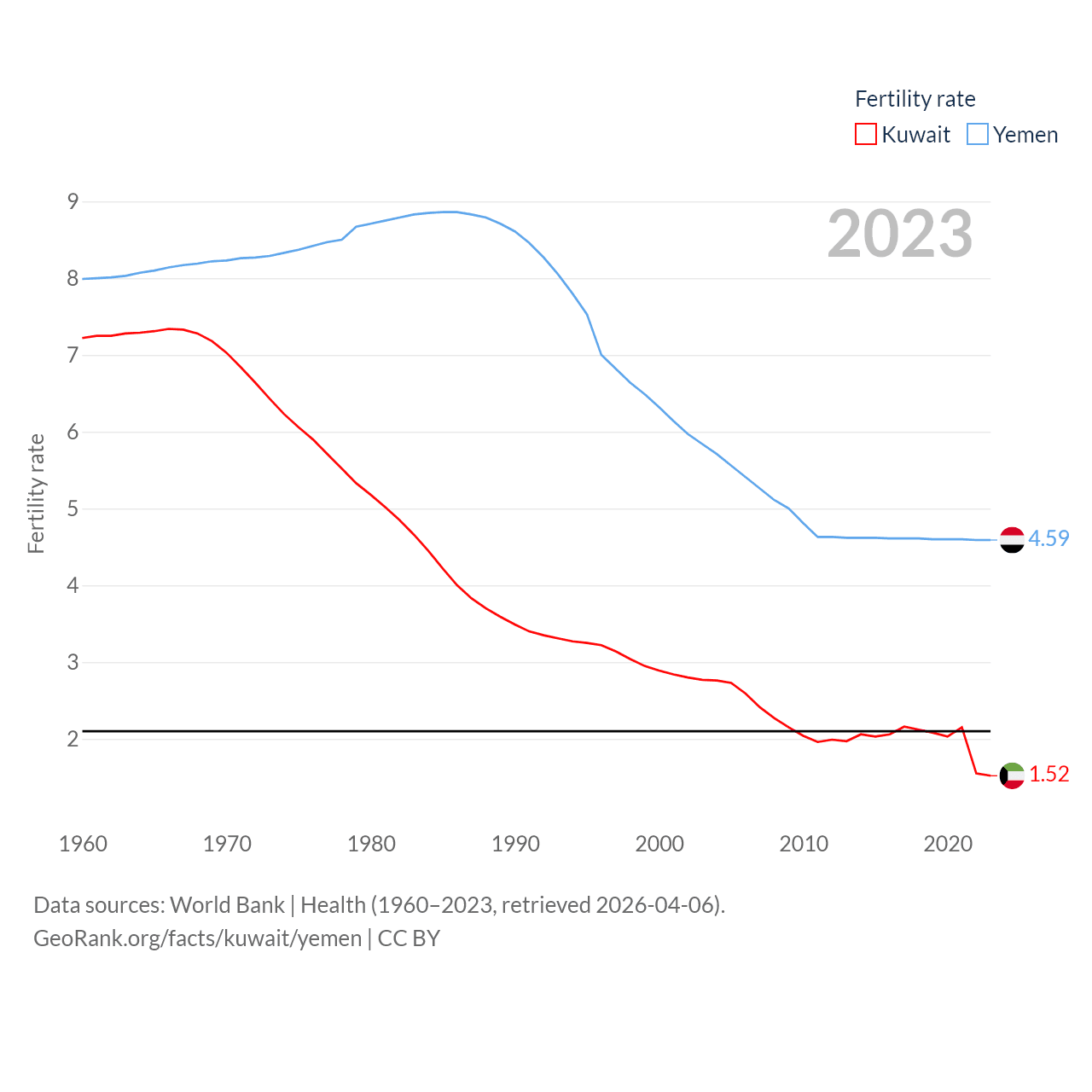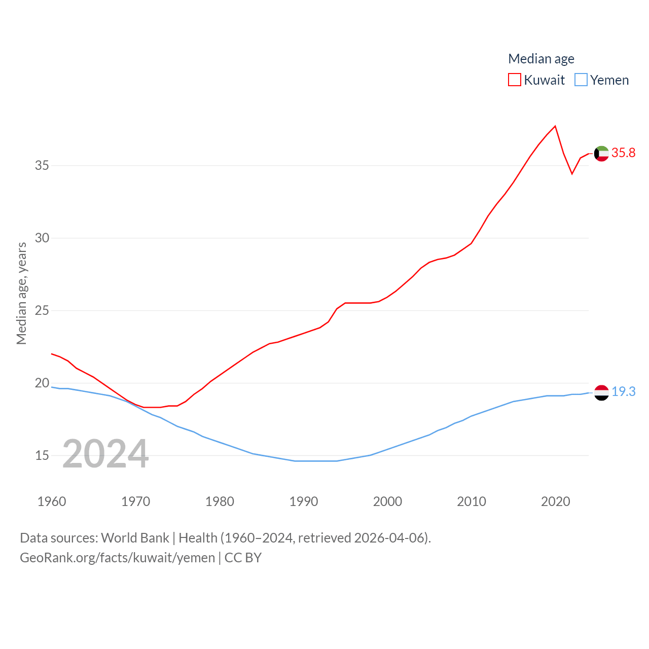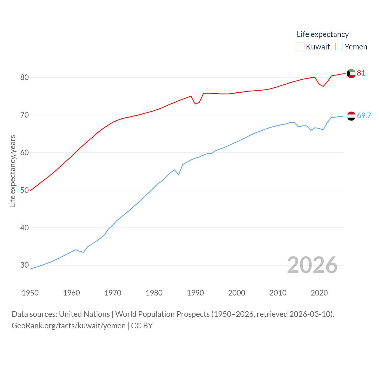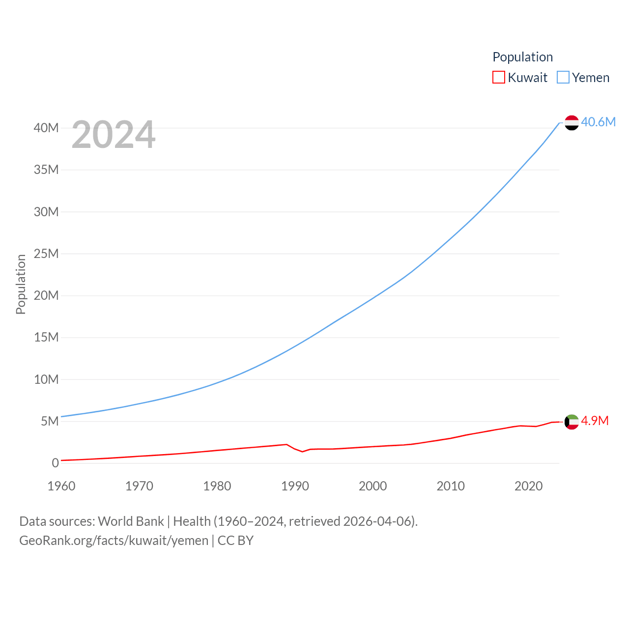 Kuwait has a population of 4.9M (ranked 127/197), compared with 40.6M in Yemen (ranked 38/197). Kuwait's land area is 6,880 sq mi versus 203,850 sq mi for Yemen (ranked 153rd vs. 49th).