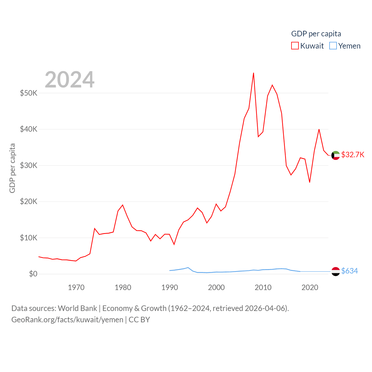 By GDP, Kuwait ranks 59/197 ($160B) and Yemen ranks 125/197 ($21.6B). By GDP per capita, Kuwait ranks 37/197 ($32,718), while Yemen ranks 191/197 ($634).