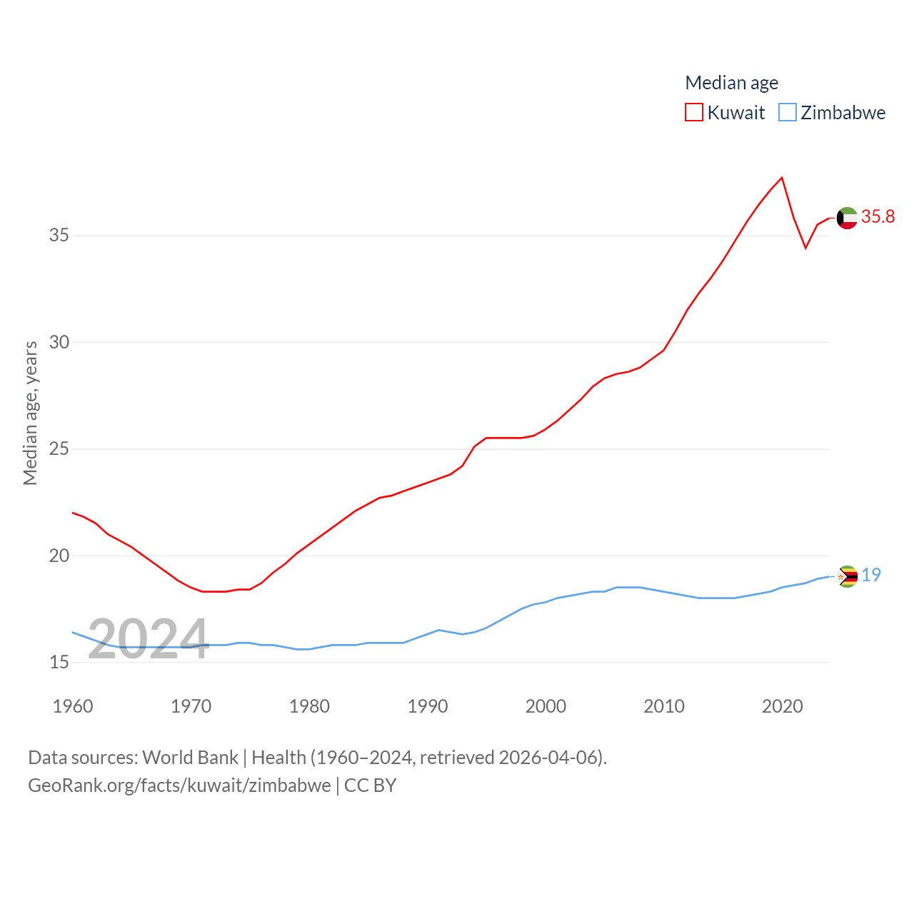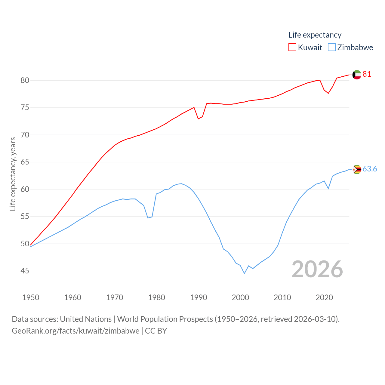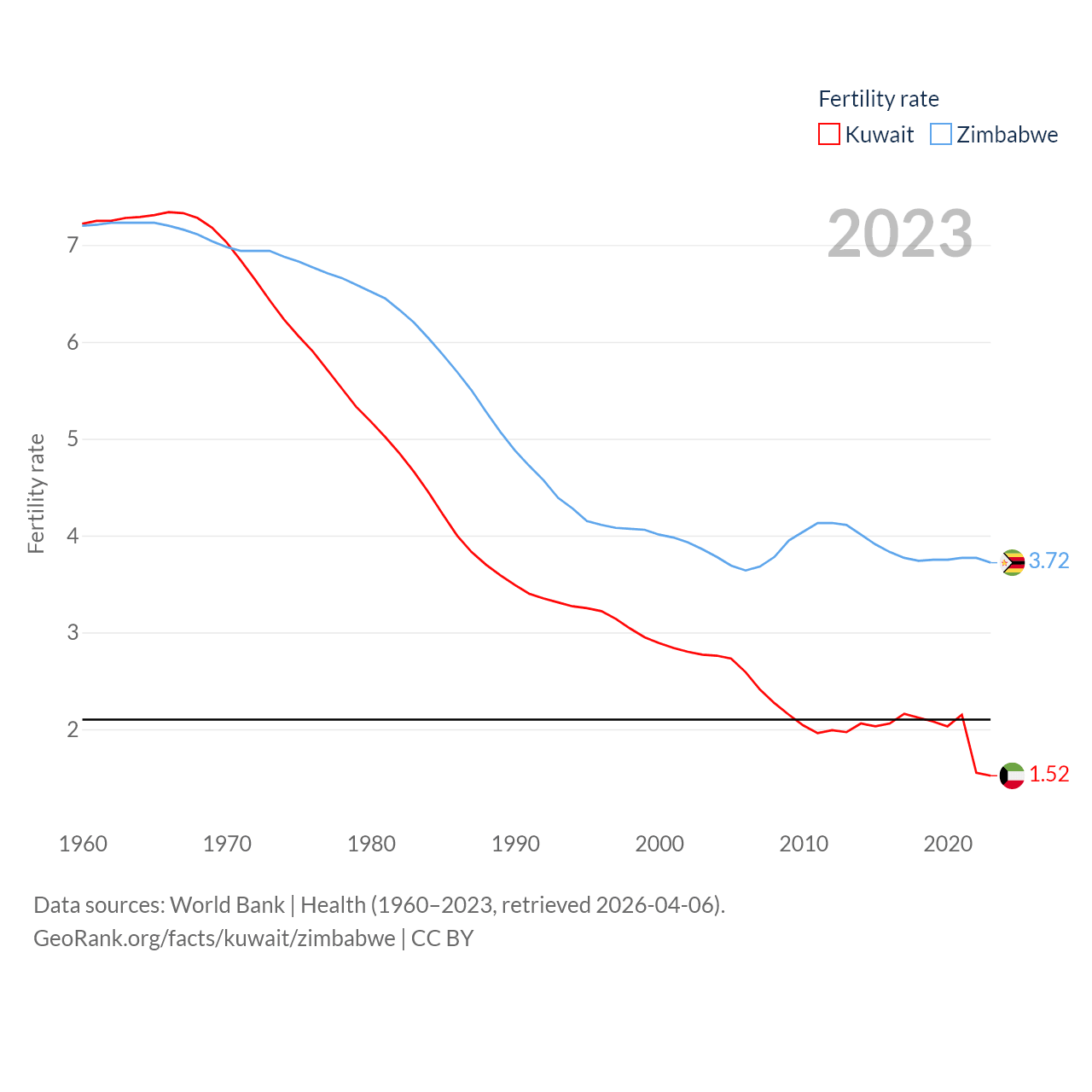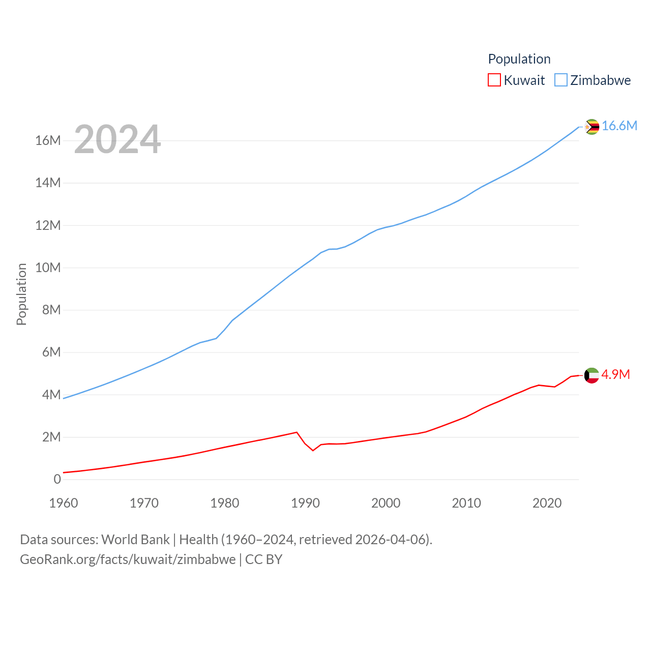 Kuwait has a population of 4.9M (ranked 127/197), compared with 16.6M in Zimbabwe (ranked 74/197). Kuwait's land area is 6,880 sq mi versus 149,364 sq mi for Zimbabwe (ranked 153rd vs. 60th).