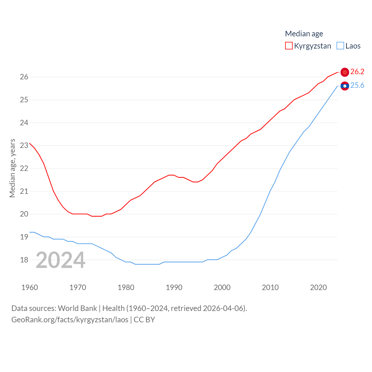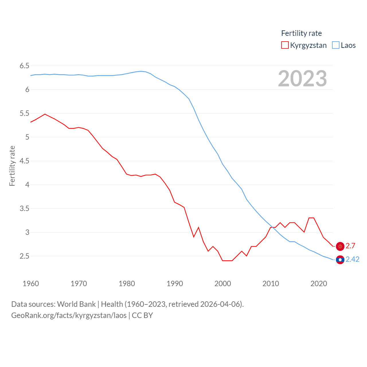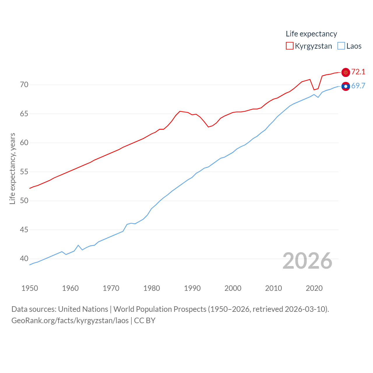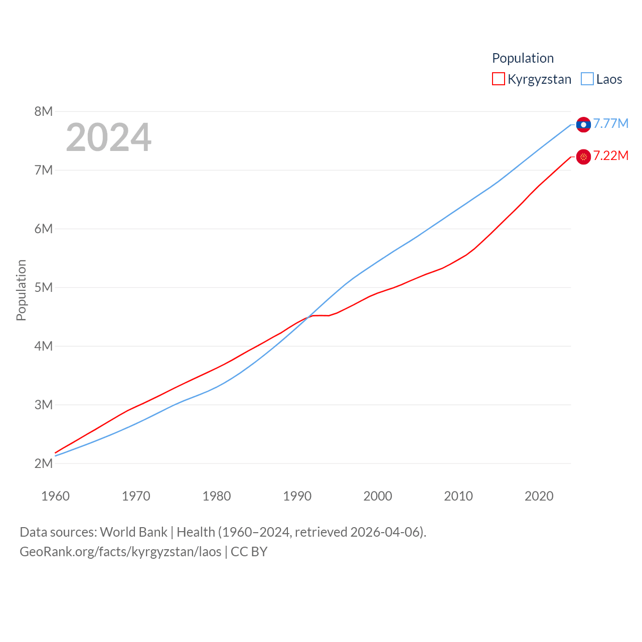 Kyrgyzstan has a population of 7.22M (ranked 106/197), compared with 7.77M in Laos (ranked 103/197). Kyrgyzstan's land area is 74,054 sq mi versus 89,112 sq mi for Laos (ranked 86th vs. 79th).