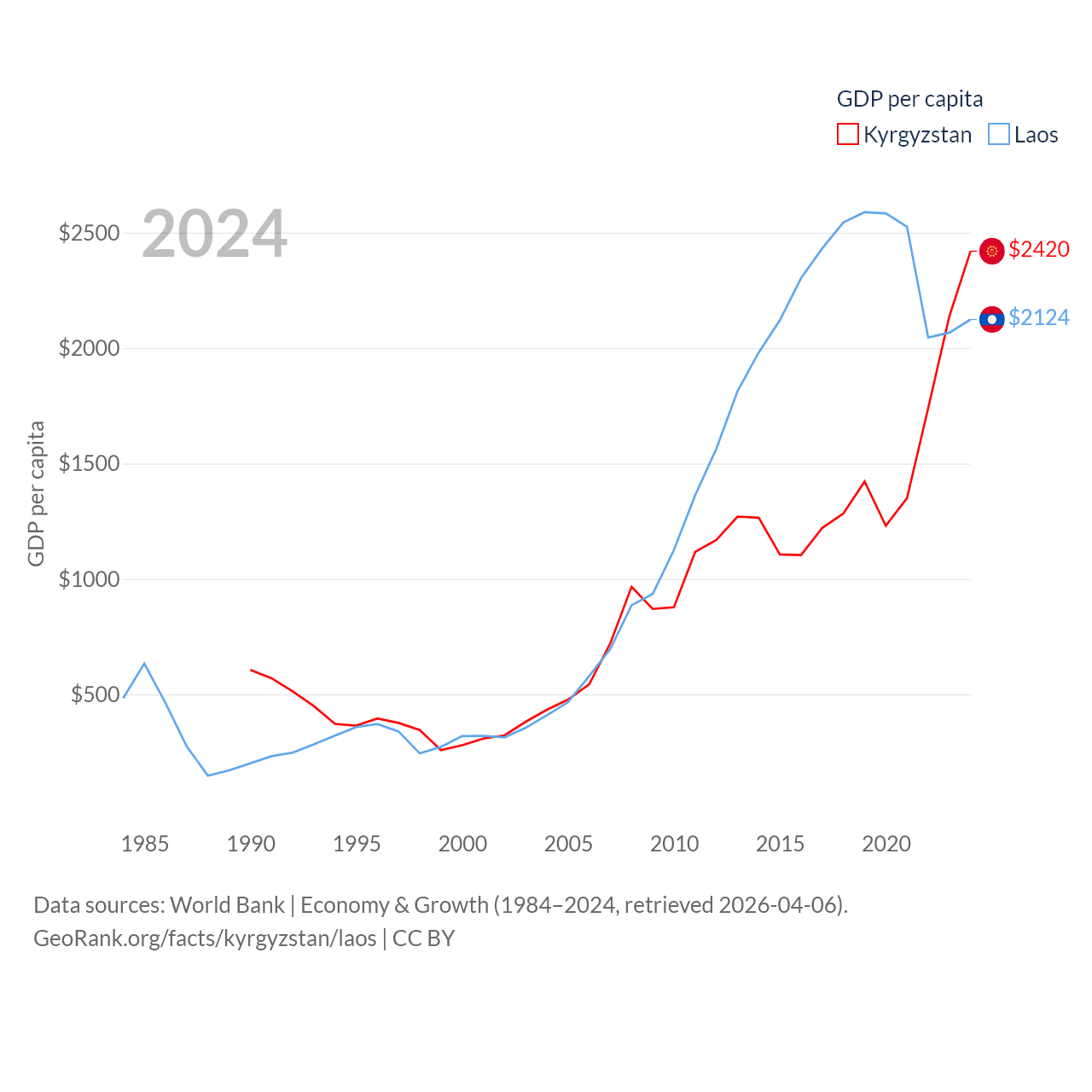 By GDP, Kyrgyzstan ranks 135/197 ($17.5B) and Laos ranks 139/197 ($16.5B). By GDP per capita, Kyrgyzstan ranks 150/197 ($2,420), while Laos ranks 155/197 ($2,124).