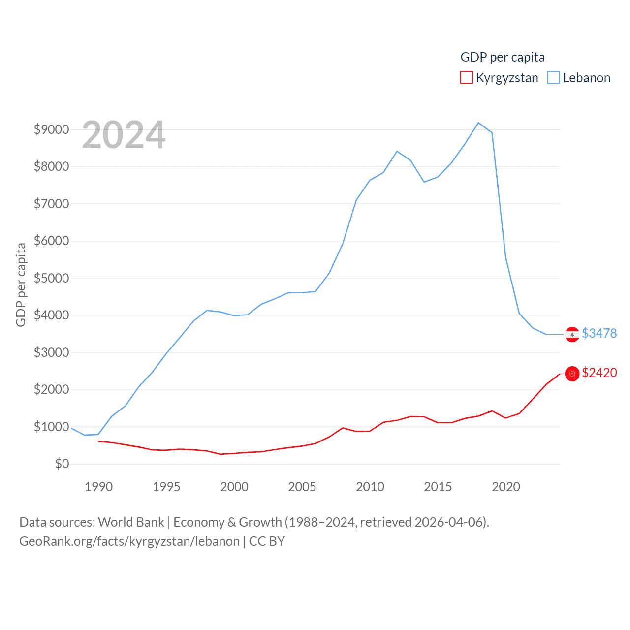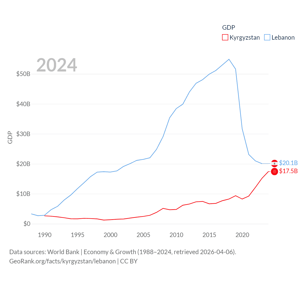 By GDP, Kyrgyzstan ranks 135/197 ($17.5B) and Lebanon ranks 128/197 ($20.1B). By GDP per capita, Kyrgyzstan ranks 150/197 ($2,420), while Lebanon ranks 135/197 ($3,478).