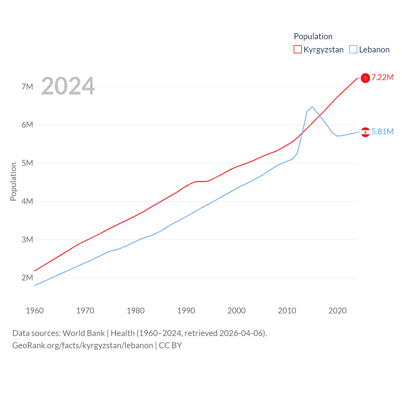 Kyrgyzstan has a population of 7.22M (ranked 106/197), compared with 5.81M in Lebanon (ranked 115/197). Kyrgyzstan's land area is 74,054 sq mi versus 3,950 sq mi for Lebanon (ranked 86th vs. 160th).