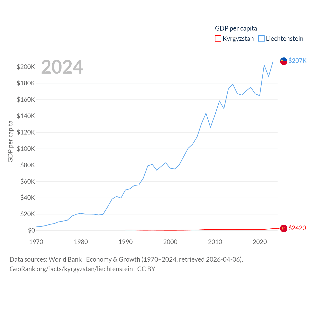 By GDP, Kyrgyzstan ranks 135/197 ($17.5B) and Liechtenstein ranks 156/197 ($8.24B). By GDP per capita, Kyrgyzstan ranks 150/197 ($2,420), while Liechtenstein ranks 2/197 ($206,781).