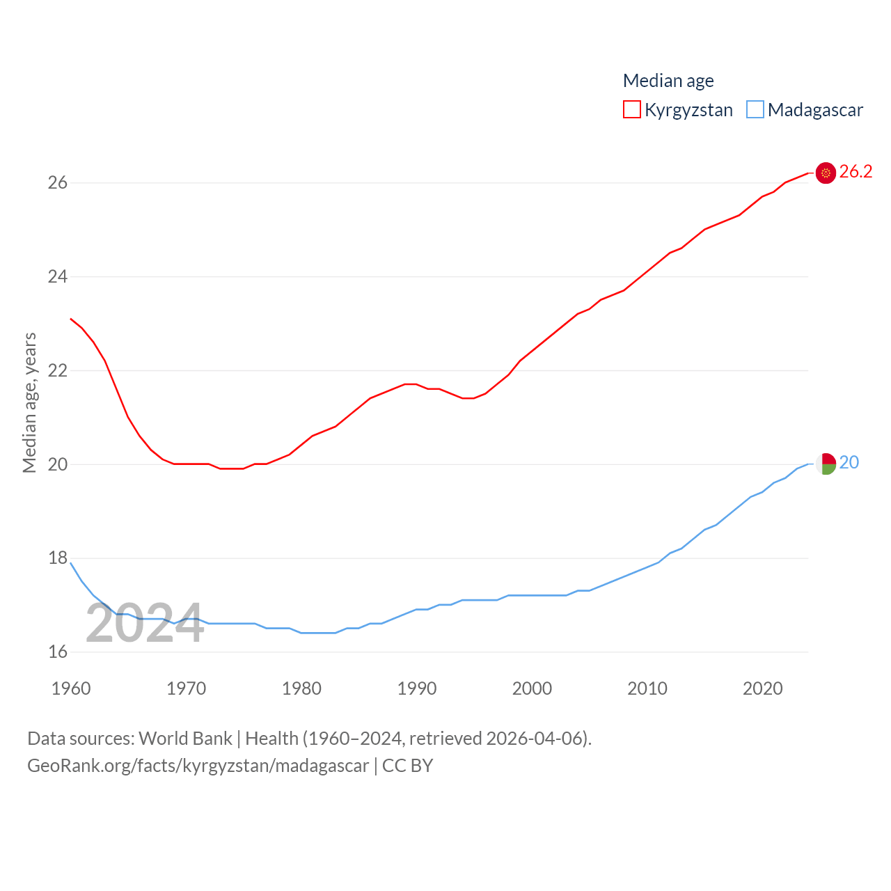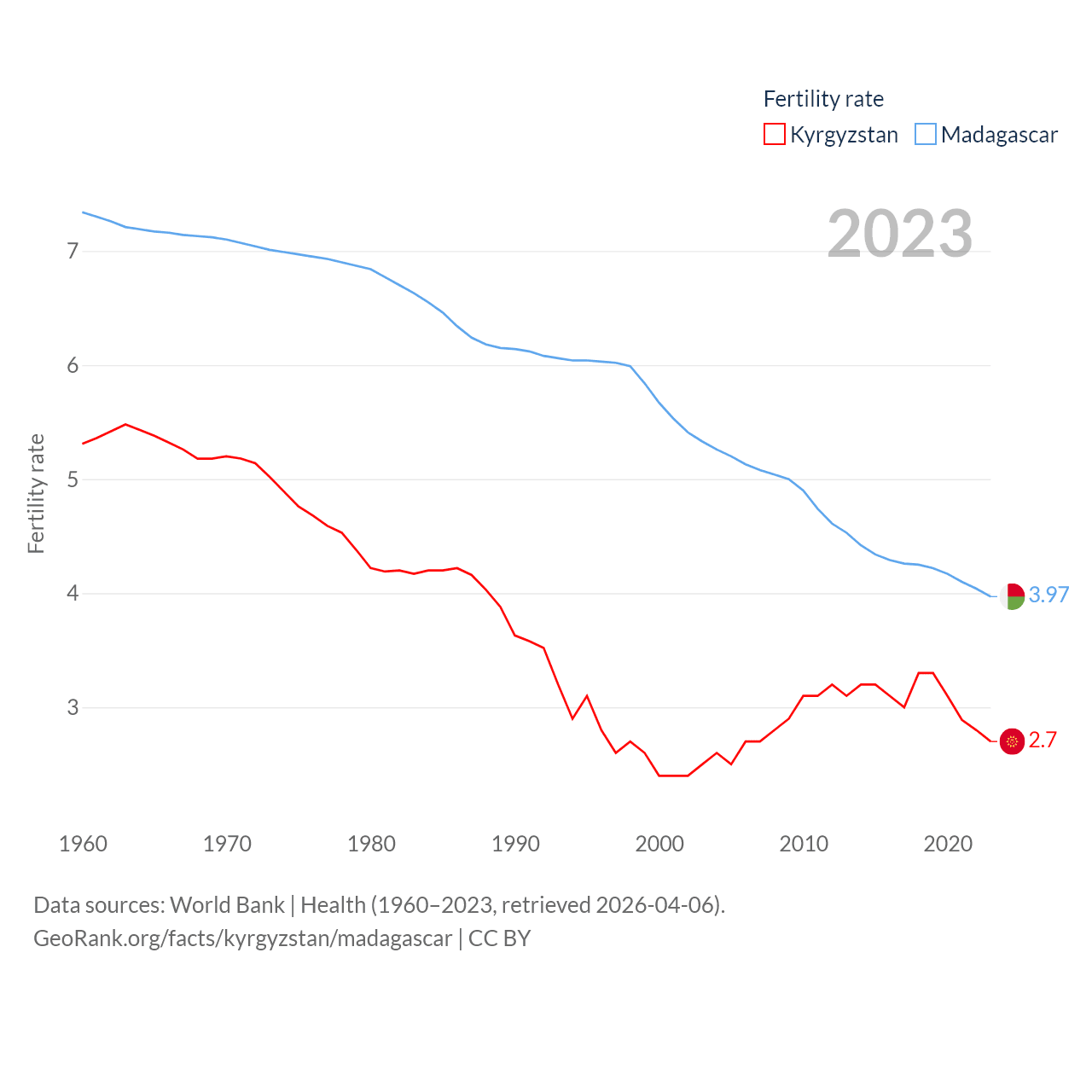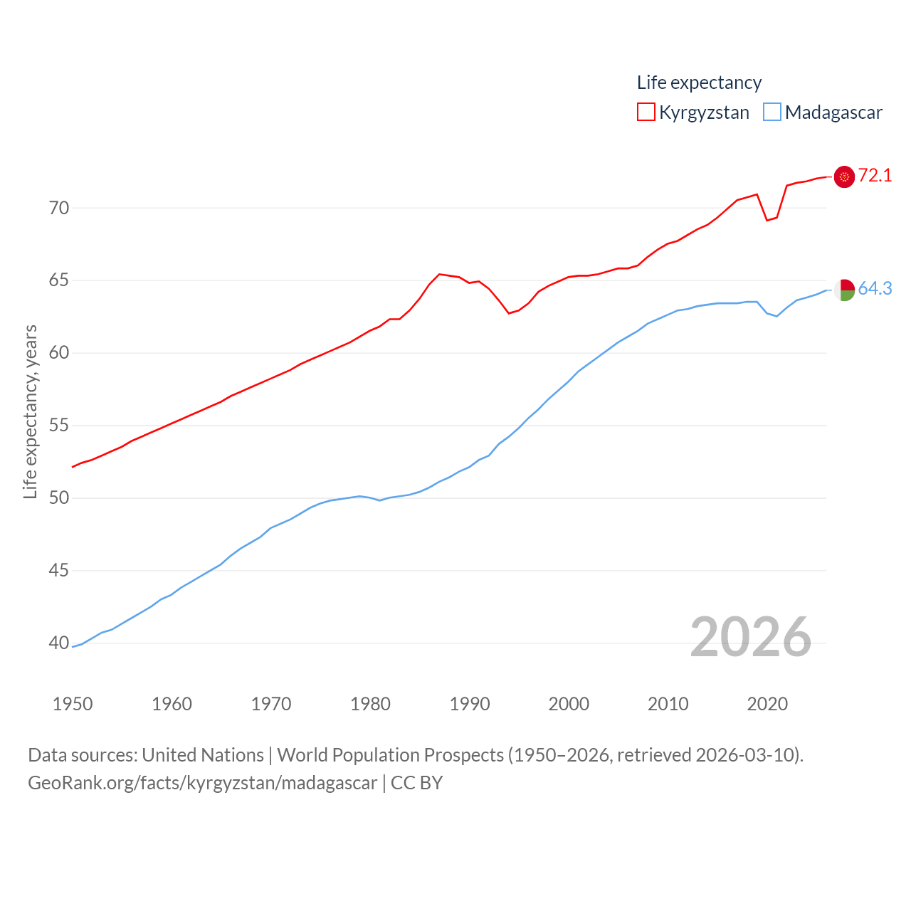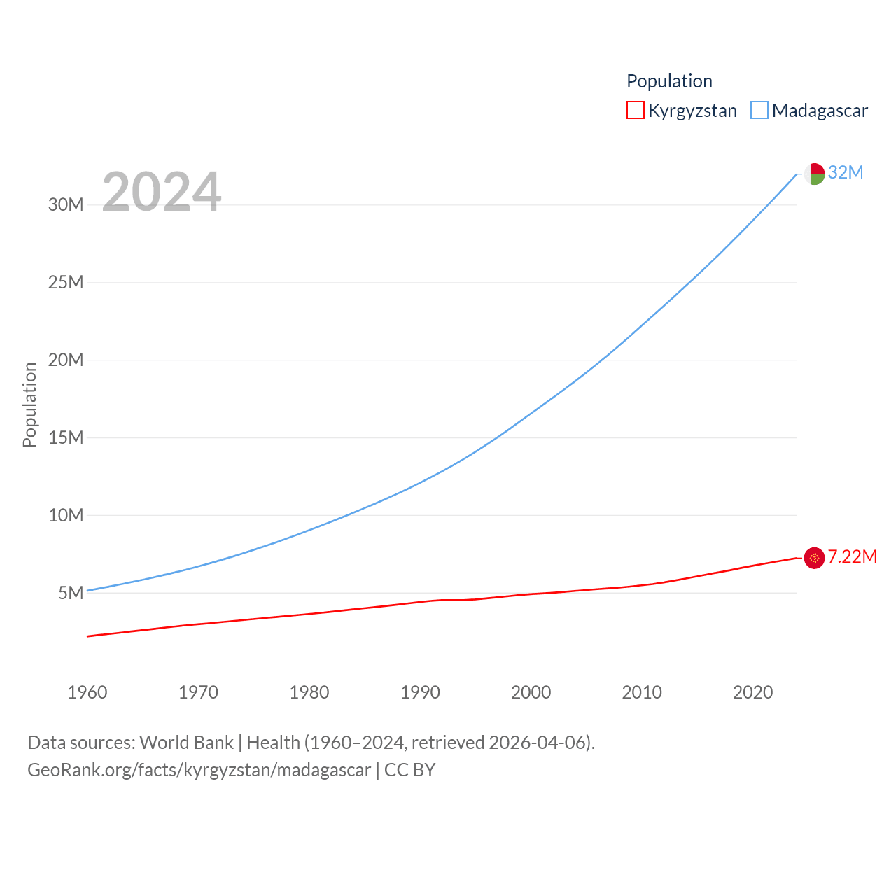 Kyrgyzstan has a population of 7.22M (ranked 106/197), compared with 32M in Madagascar (ranked 49/197). Kyrgyzstan's land area is 74,054 sq mi versus 224,634 sq mi for Madagascar (ranked 86th vs. 44th).