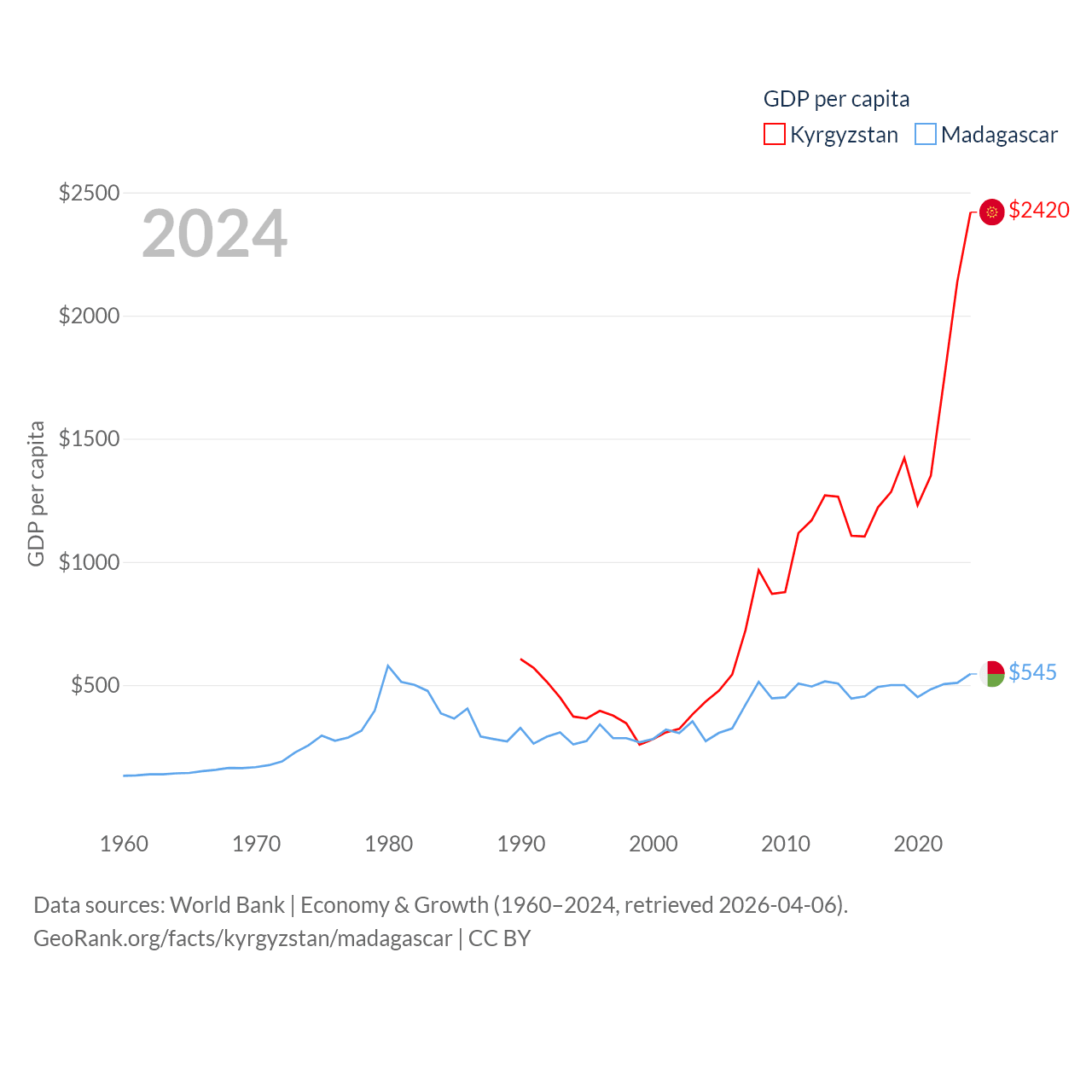 By GDP, Kyrgyzstan ranks 135/197 ($17.5B) and Madagascar ranks 136/197 ($17.4B). By GDP per capita, Kyrgyzstan ranks 150/197 ($2,420), while Madagascar ranks 193/197 ($545).