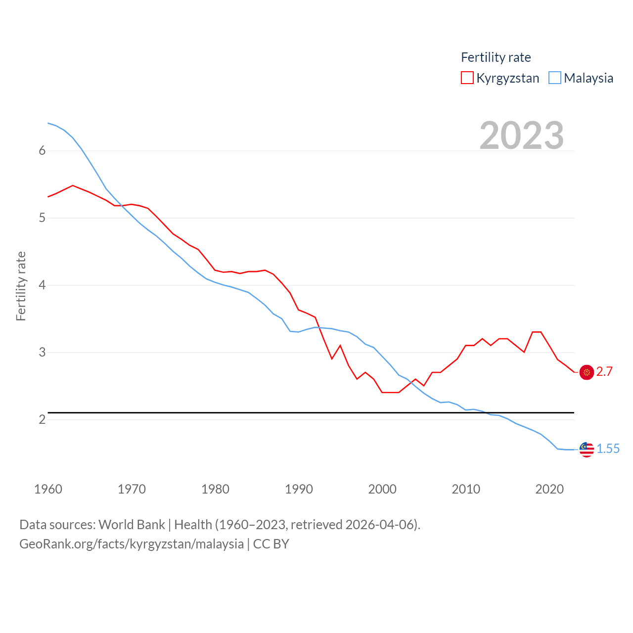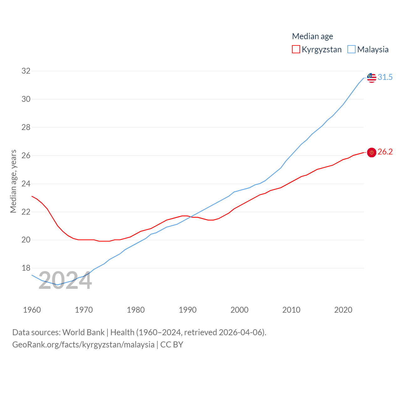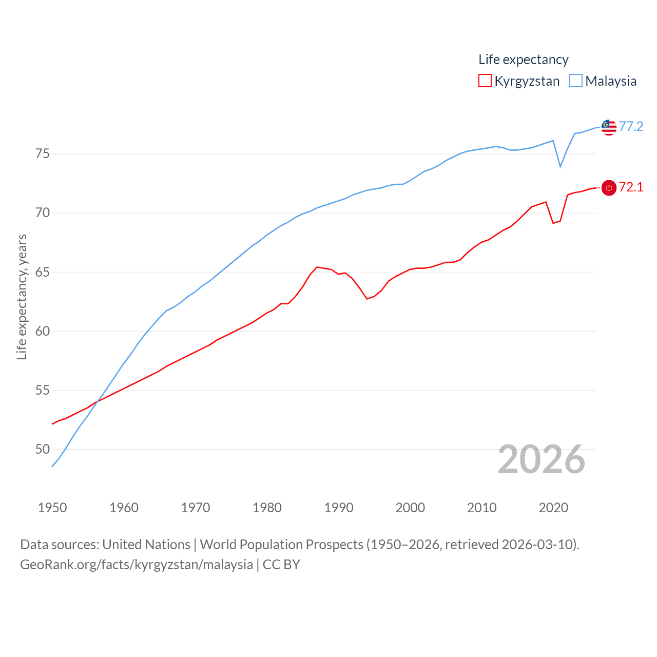 Kyrgyzstan has a population of 7.22M (ranked 106/197), compared with 35.6M in Malaysia (ranked 44/197). Kyrgyzstan's land area is 74,054 sq mi versus 126,854 sq mi for Malaysia (ranked 86th vs. 65th).