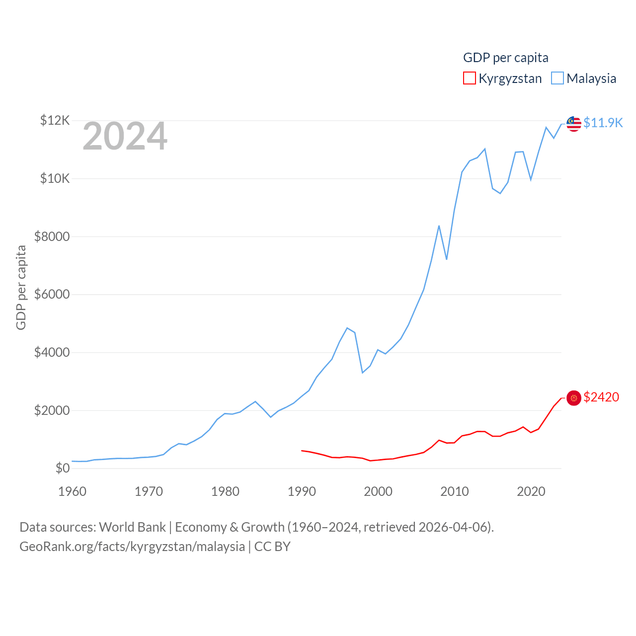 By GDP, Kyrgyzstan ranks 135/197 ($17.5B) and Malaysia ranks 38/197 ($422B). By GDP per capita, Kyrgyzstan ranks 150/197 ($2,420), while Malaysia ranks 79/197 ($11,874).