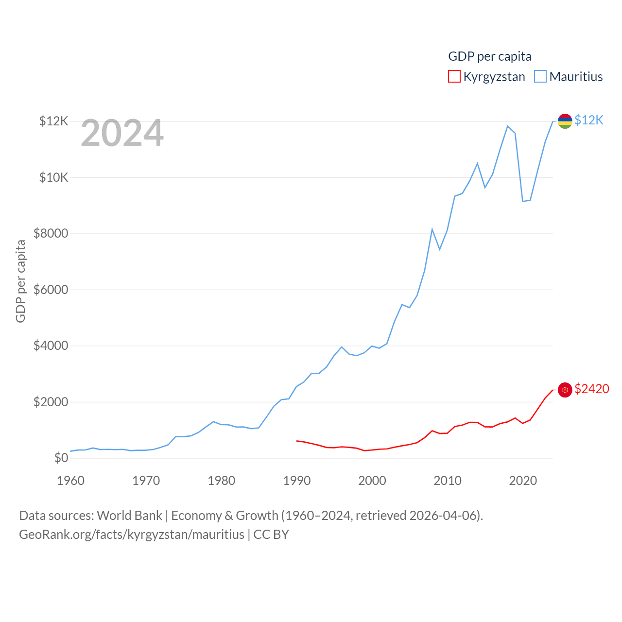 By GDP, Kyrgyzstan ranks 135/197 ($17.5B) and Mauritius ranks 143/197 ($14.9B). By GDP per capita, Kyrgyzstan ranks 150/197 ($2,420), while Mauritius ranks 78/197 ($11,991).