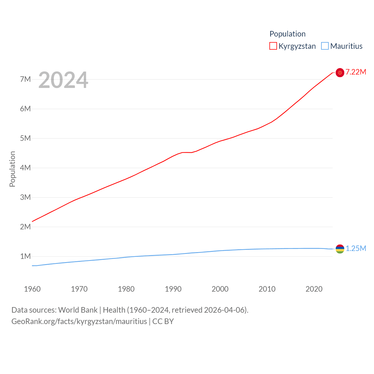 Kyrgyzstan has a population of 7.22M (ranked 106/197), compared with 1.25M in Mauritius (ranked 156/197). Kyrgyzstan's land area is 74,054 sq mi versus 771 sq mi for Mauritius (ranked 86th vs. 170th).