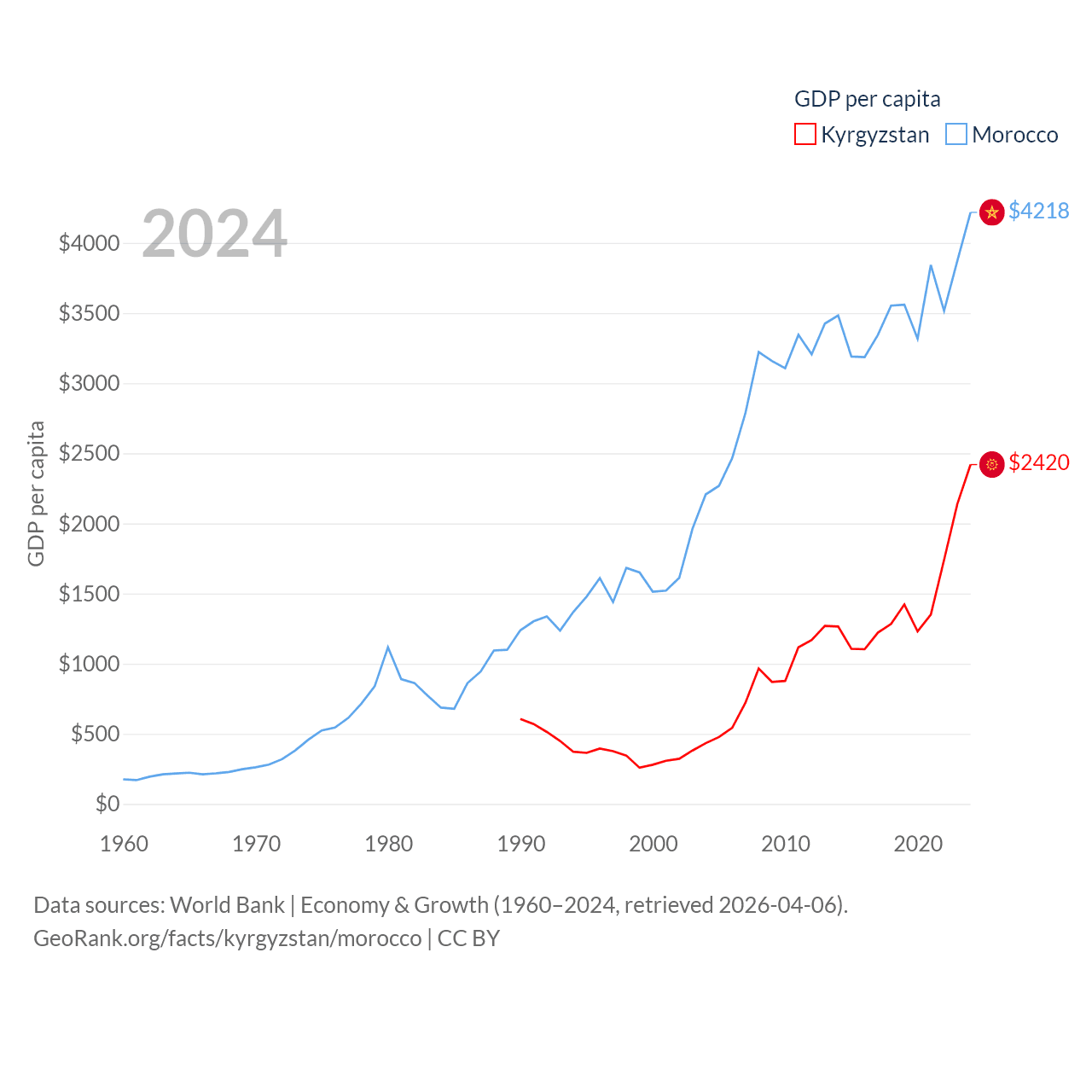 By GDP, Kyrgyzstan ranks 135/197 ($17.5B) and Morocco ranks 58/197 ($161B). By GDP per capita, Kyrgyzstan ranks 150/197 ($2,420), while Morocco ranks 127/197 ($4,218).