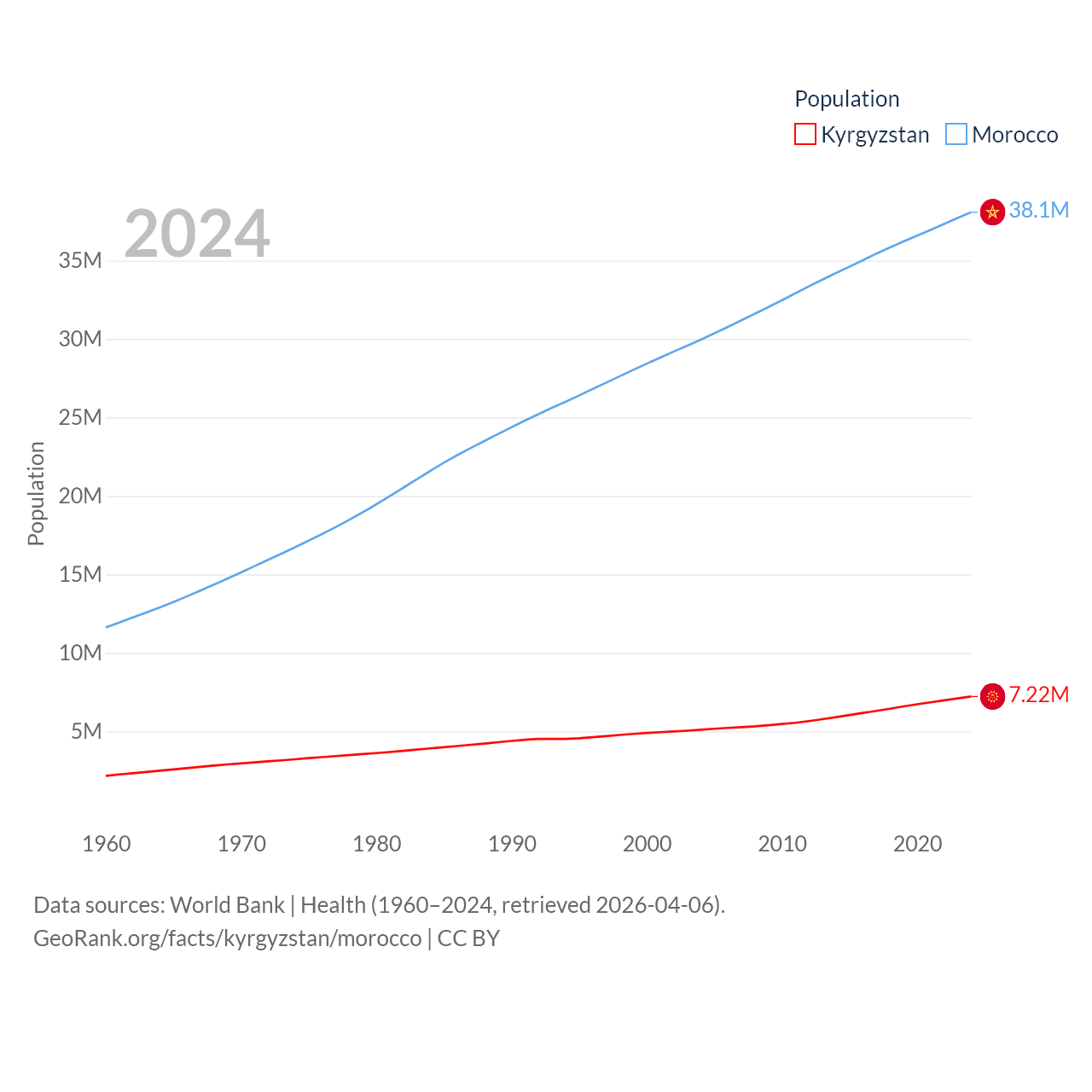 Kyrgyzstan has a population of 7.22M (ranked 106/197), compared with 38.1M in Morocco (ranked 39/197). Kyrgyzstan's land area is 74,054 sq mi versus 172,317 sq mi for Morocco (ranked 86th vs. 55th).