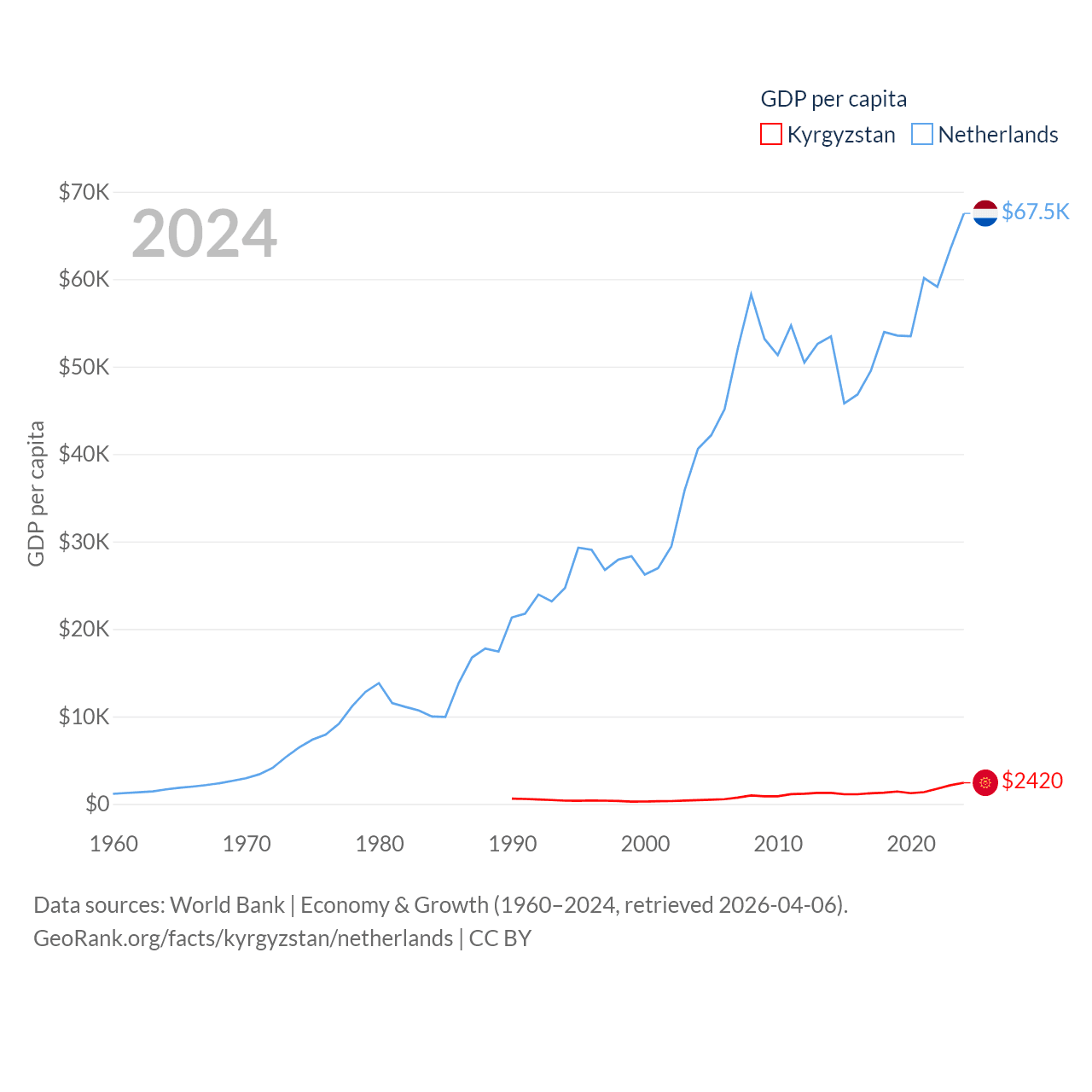 By GDP, Kyrgyzstan ranks 135/197 ($17.5B) and The Netherlands ranks 19/197 ($1.21T). By GDP per capita, Kyrgyzstan ranks 150/197 ($2,420), while The Netherlands ranks 13/197 ($67,520).