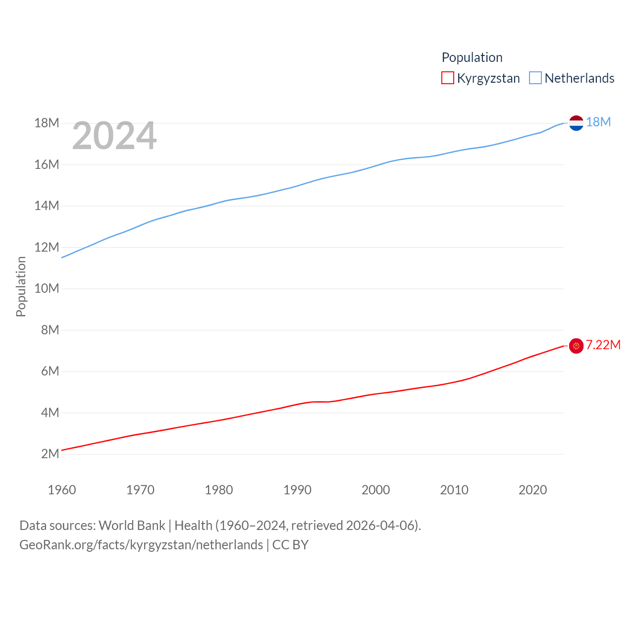 Kyrgyzstan has a population of 7.22M (ranked 106/197), compared with 18M in The Netherlands (ranked 72/197). Kyrgyzstan's land area is 74,054 sq mi versus 13,000 sq mi for The Netherlands (ranked 86th vs. 134th).