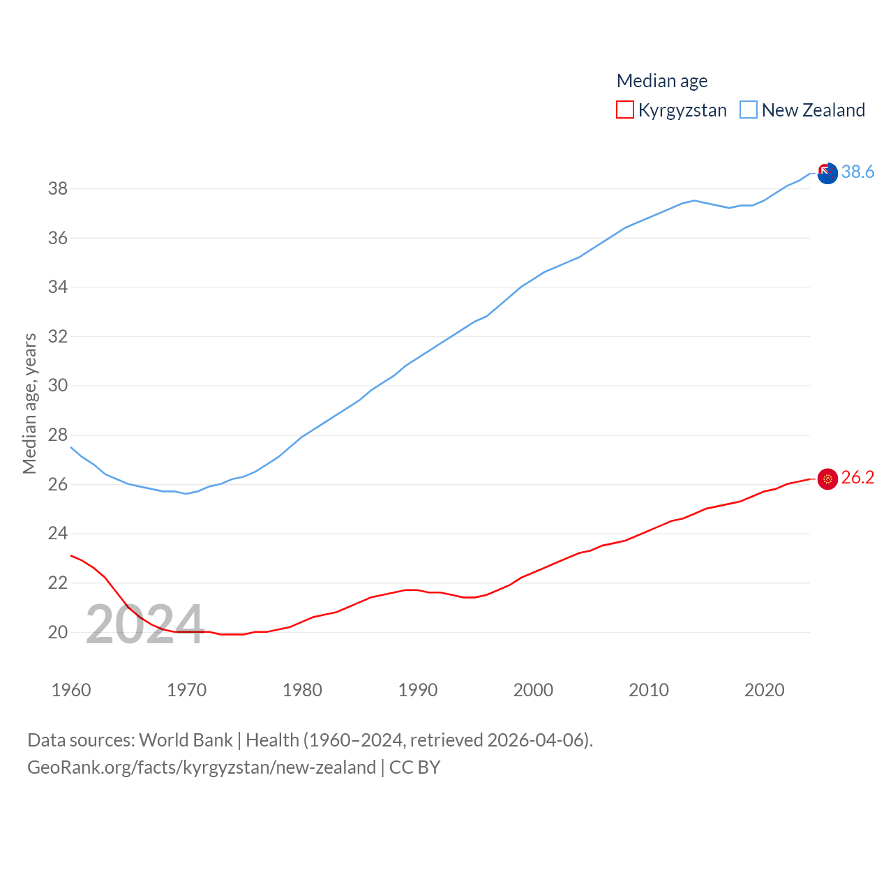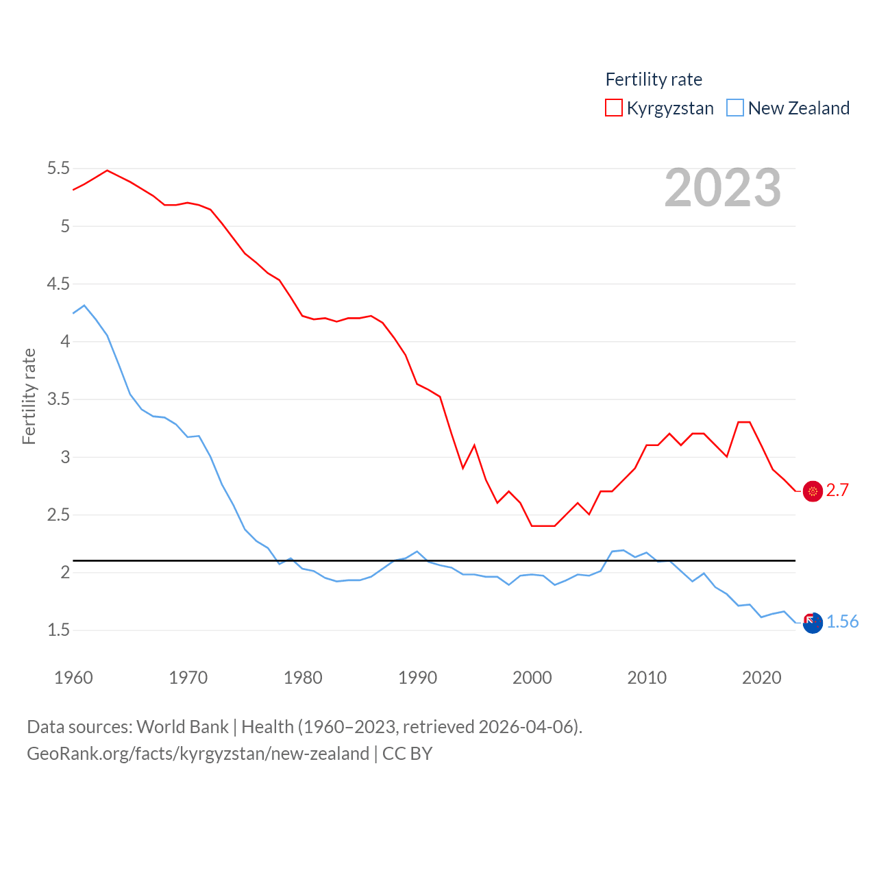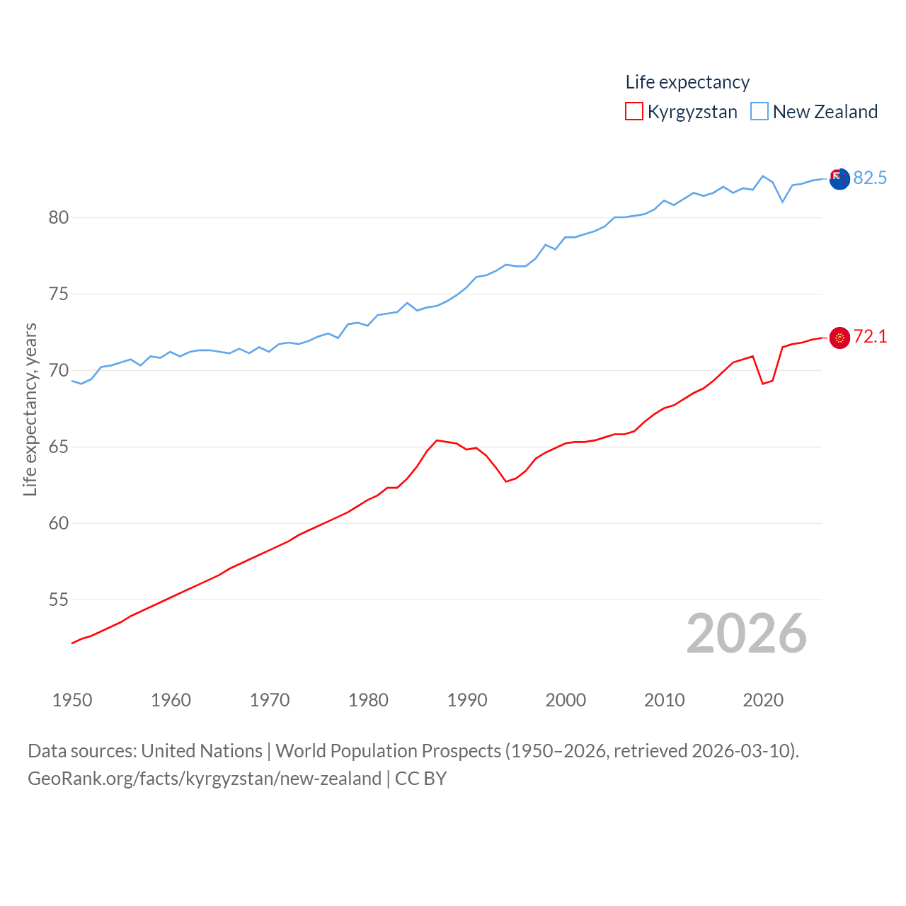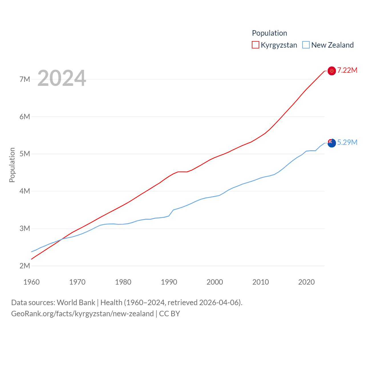 Kyrgyzstan has a population of 7.22M (ranked 106/197), compared with 5.29M in New Zealand (ranked 123/197). Kyrgyzstan's land area is 74,054 sq mi versus 101,665 sq mi for New Zealand (ranked 86th vs. 74th).