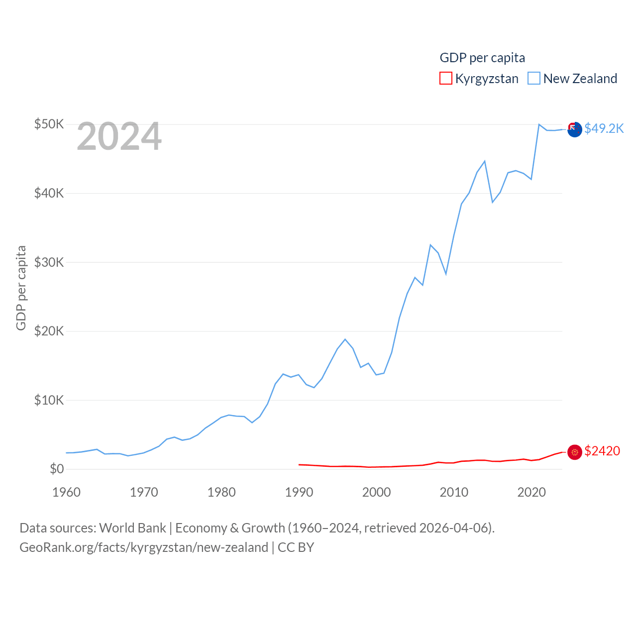 By GDP, Kyrgyzstan ranks 135/197 ($17.5B) and New Zealand ranks 52/197 ($260B). By GDP per capita, Kyrgyzstan ranks 150/197 ($2,420), while New Zealand ranks 26/197 ($49,205).