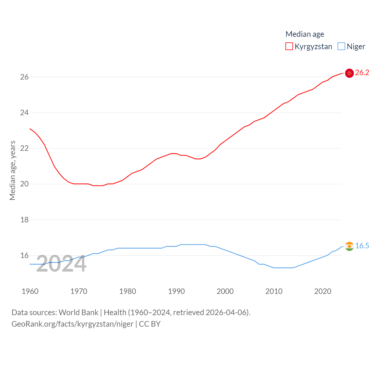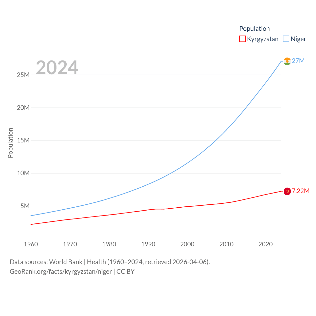 Kyrgyzstan has a population of 7.22M (ranked 106/197), compared with 27M in Niger (ranked 55/197). Kyrgyzstan's land area is 74,054 sq mi versus 489,076 sq mi for Niger (ranked 86th vs. 20th).