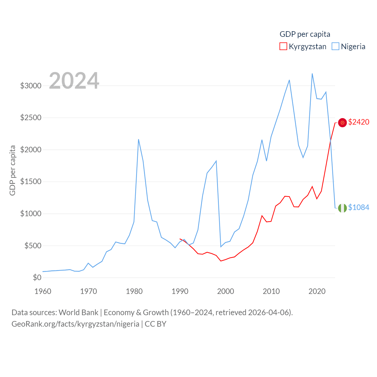 By GDP, Kyrgyzstan ranks 135/197 ($17.5B) and Nigeria ranks 54/197 ($252B). By GDP per capita, Kyrgyzstan ranks 150/197 ($2,420), while Nigeria ranks 174/197 ($1,084).
