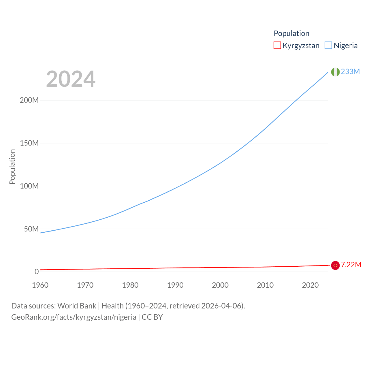 Kyrgyzstan has a population of 7.22M (ranked 106/197), compared with 233M in Nigeria (ranked 6/197). Kyrgyzstan's land area is 74,054 sq mi versus 351,650 sq mi for Nigeria (ranked 86th vs. 30th).