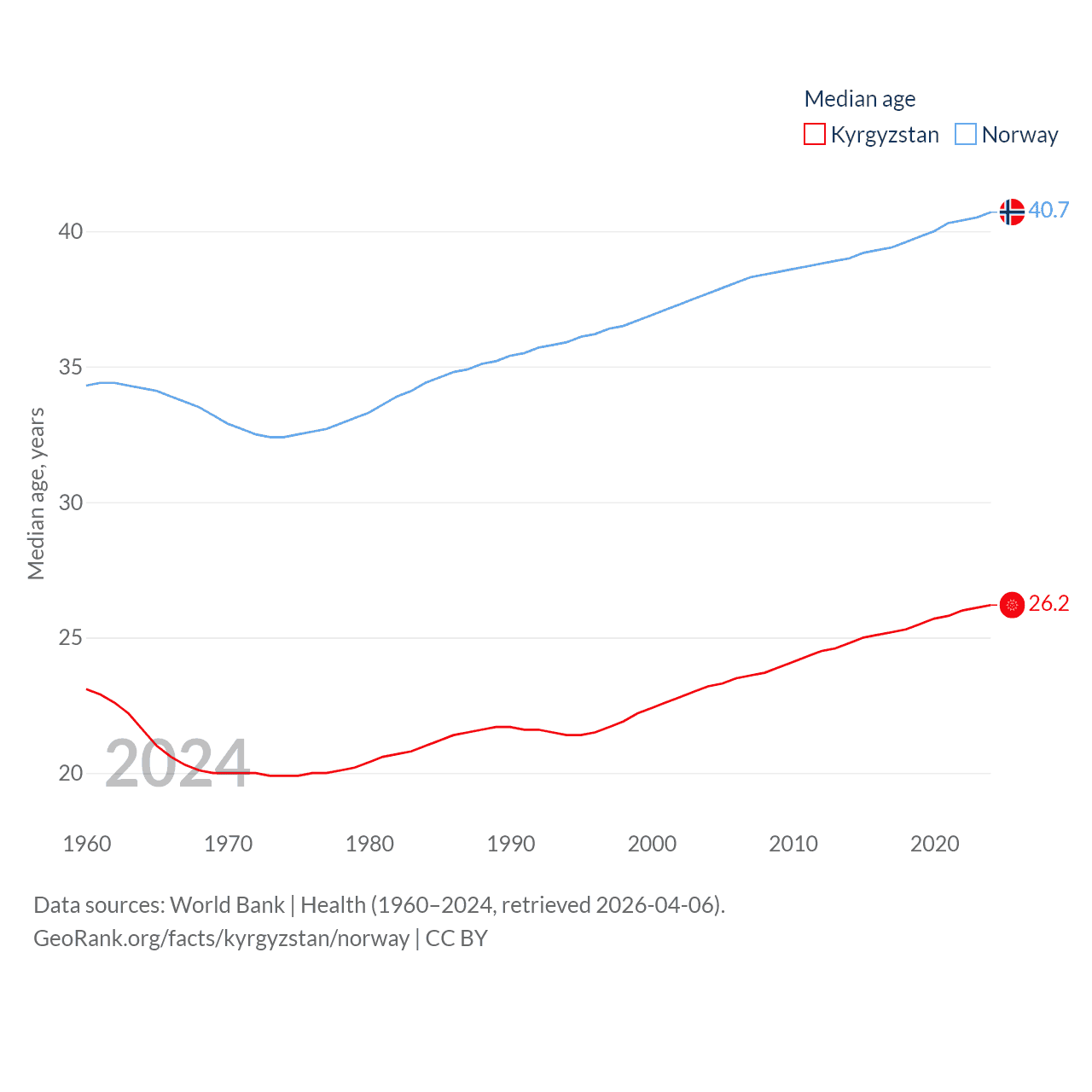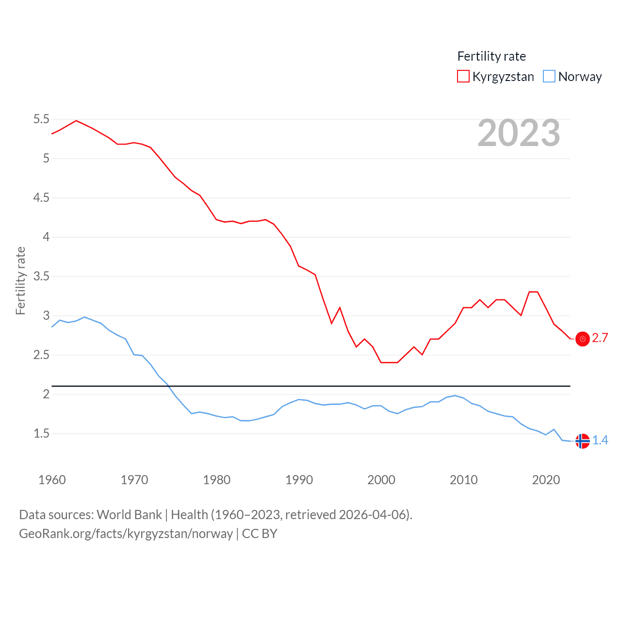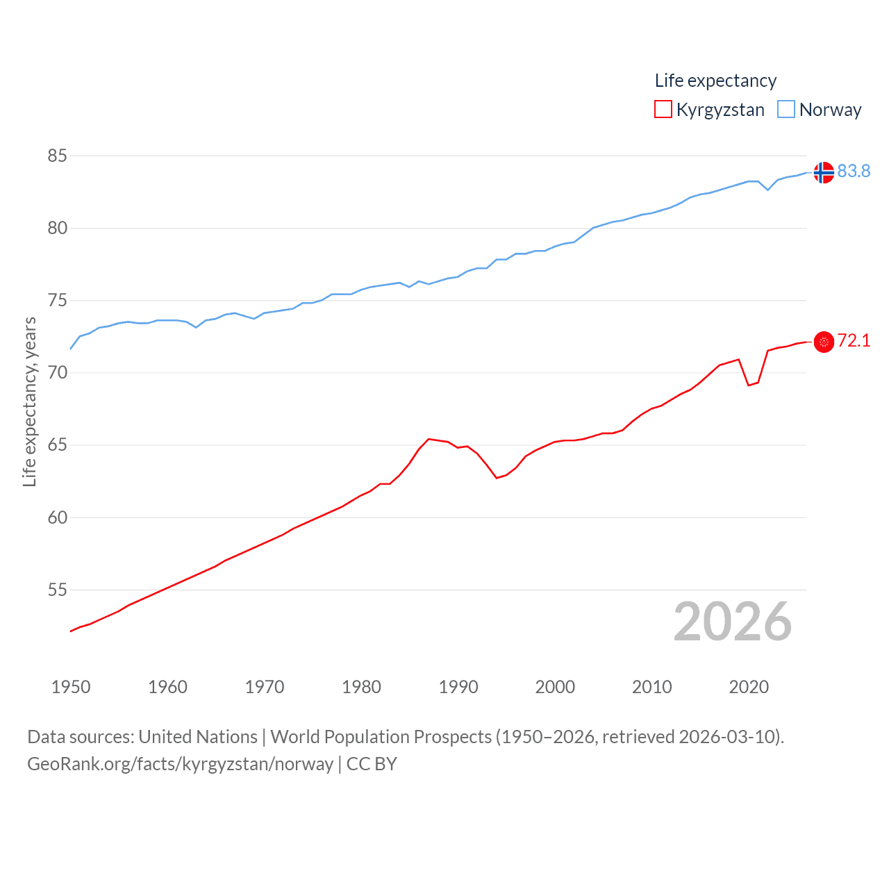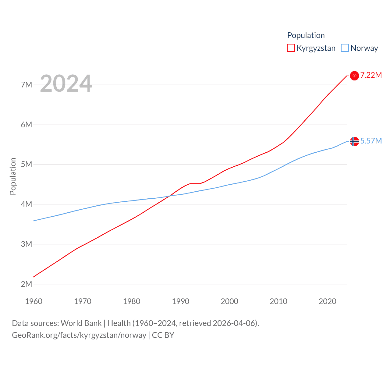 Kyrgyzstan has a population of 7.22M (ranked 106/197), compared with 5.57M in Norway (ranked 118/197). Kyrgyzstan's land area is 74,054 sq mi versus 140,645 sq mi for Norway (ranked 86th vs. 62nd).