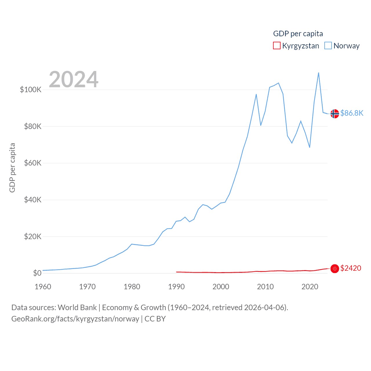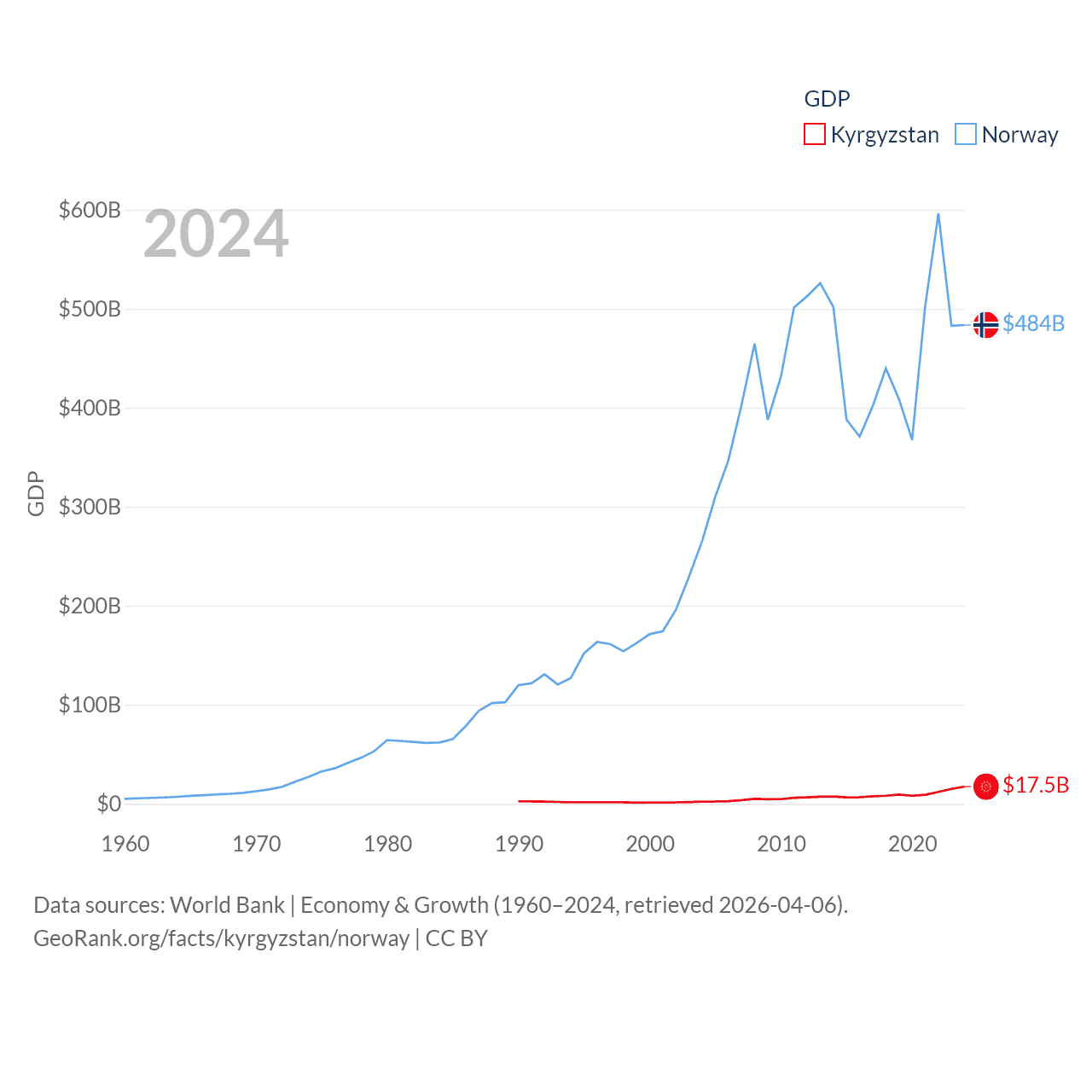 By GDP, Kyrgyzstan ranks 135/197 ($17.5B) and Norway ranks 32/197 ($484B). By GDP per capita, Kyrgyzstan ranks 150/197 ($2,420), while Norway ranks 8/197 ($86,785).