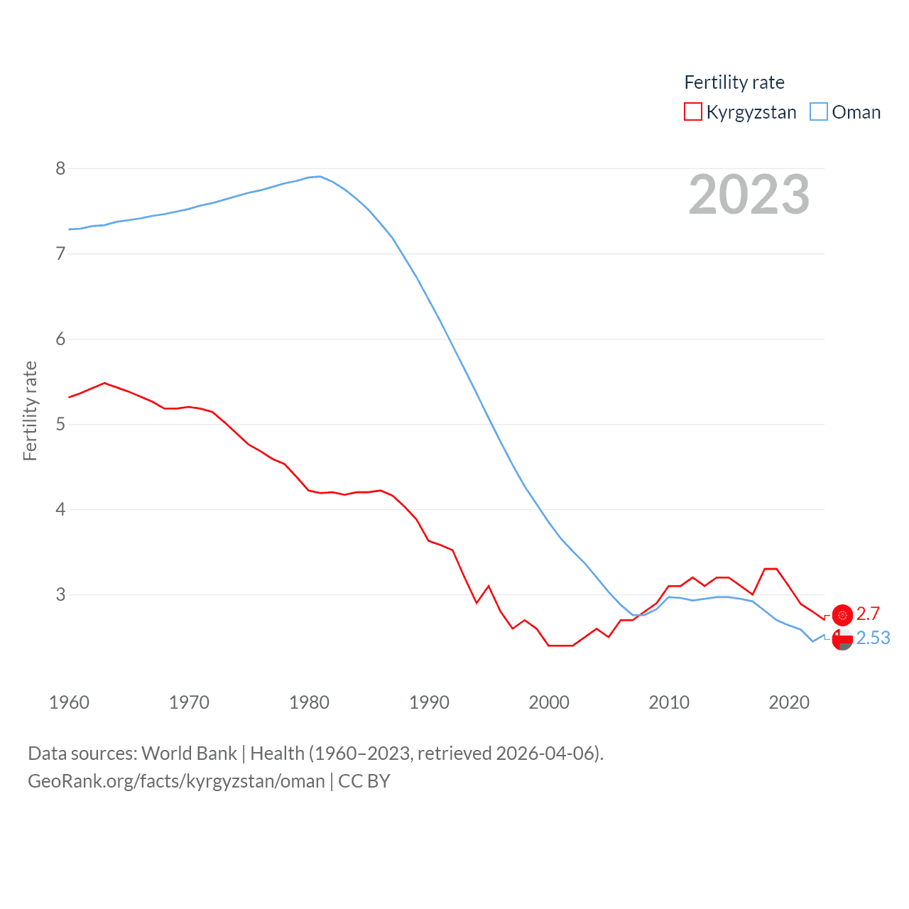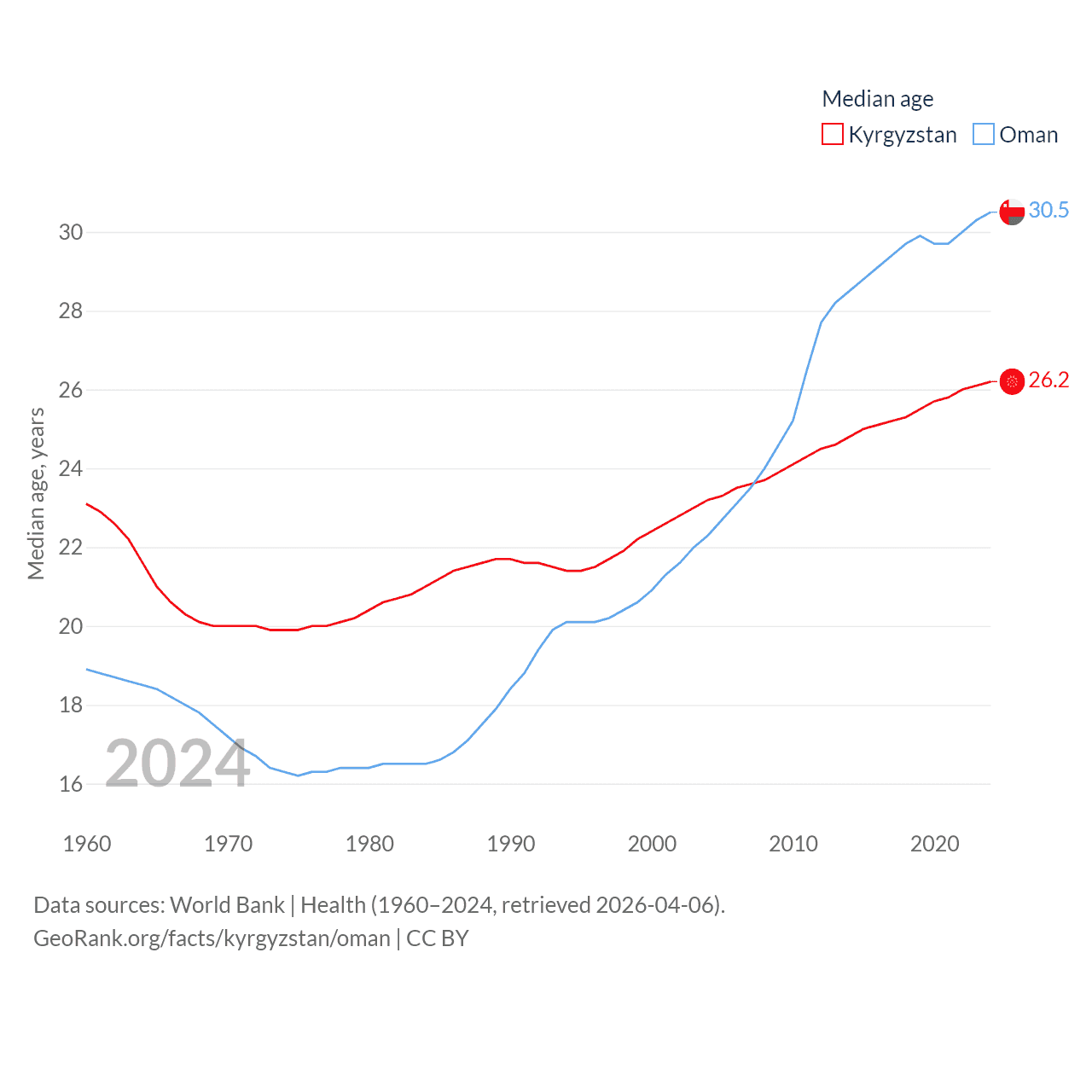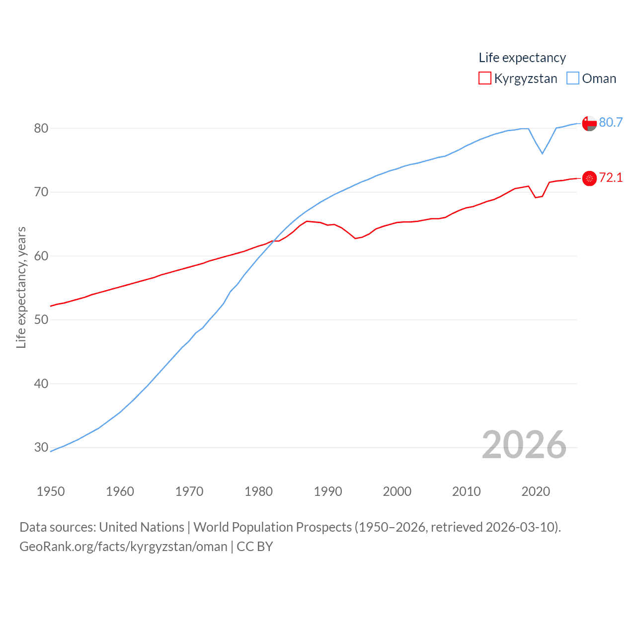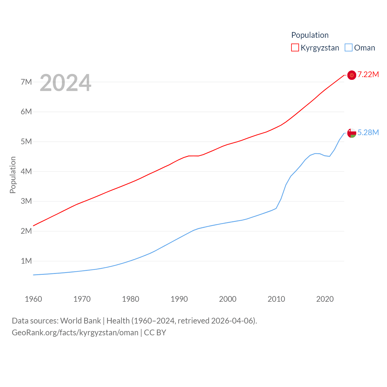Kyrgyzstan has a population of 7.22M (ranked 106/197), compared with 5.28M in Oman (ranked 124/197). Kyrgyzstan's land area is 74,054 sq mi versus 119,499 sq mi for Oman (ranked 86th vs. 68th).