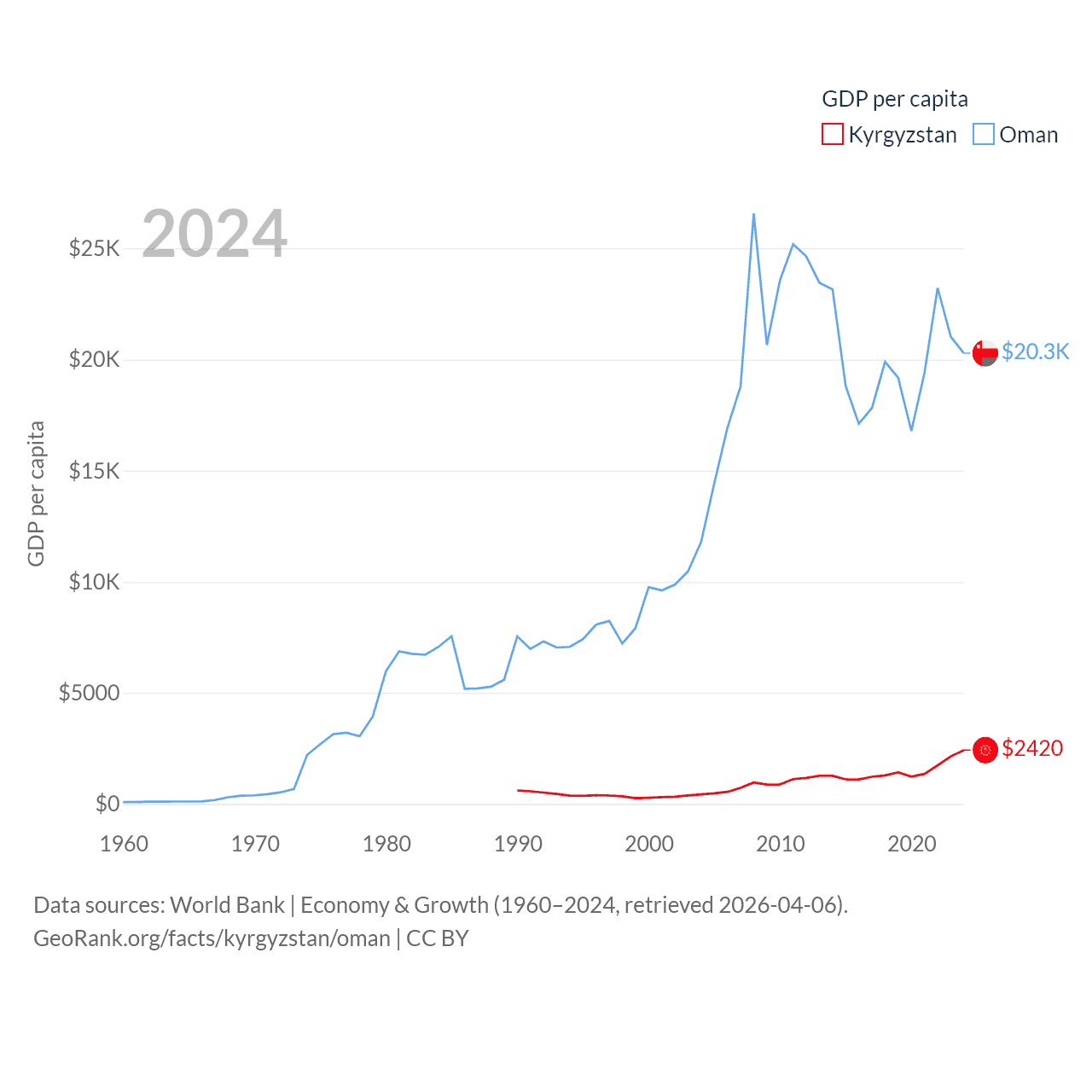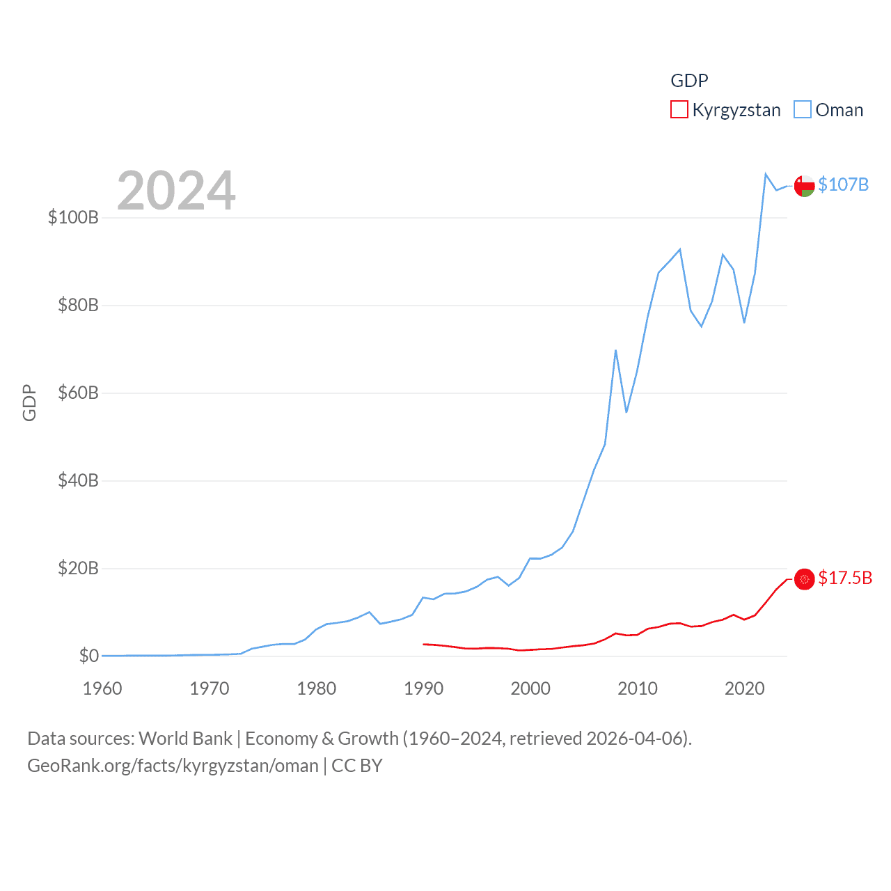 By GDP, Kyrgyzstan ranks 135/197 ($17.5B) and Oman ranks 70/197 ($107B). By GDP per capita, Kyrgyzstan ranks 150/197 ($2,420), while Oman ranks 57/197 ($20,285).