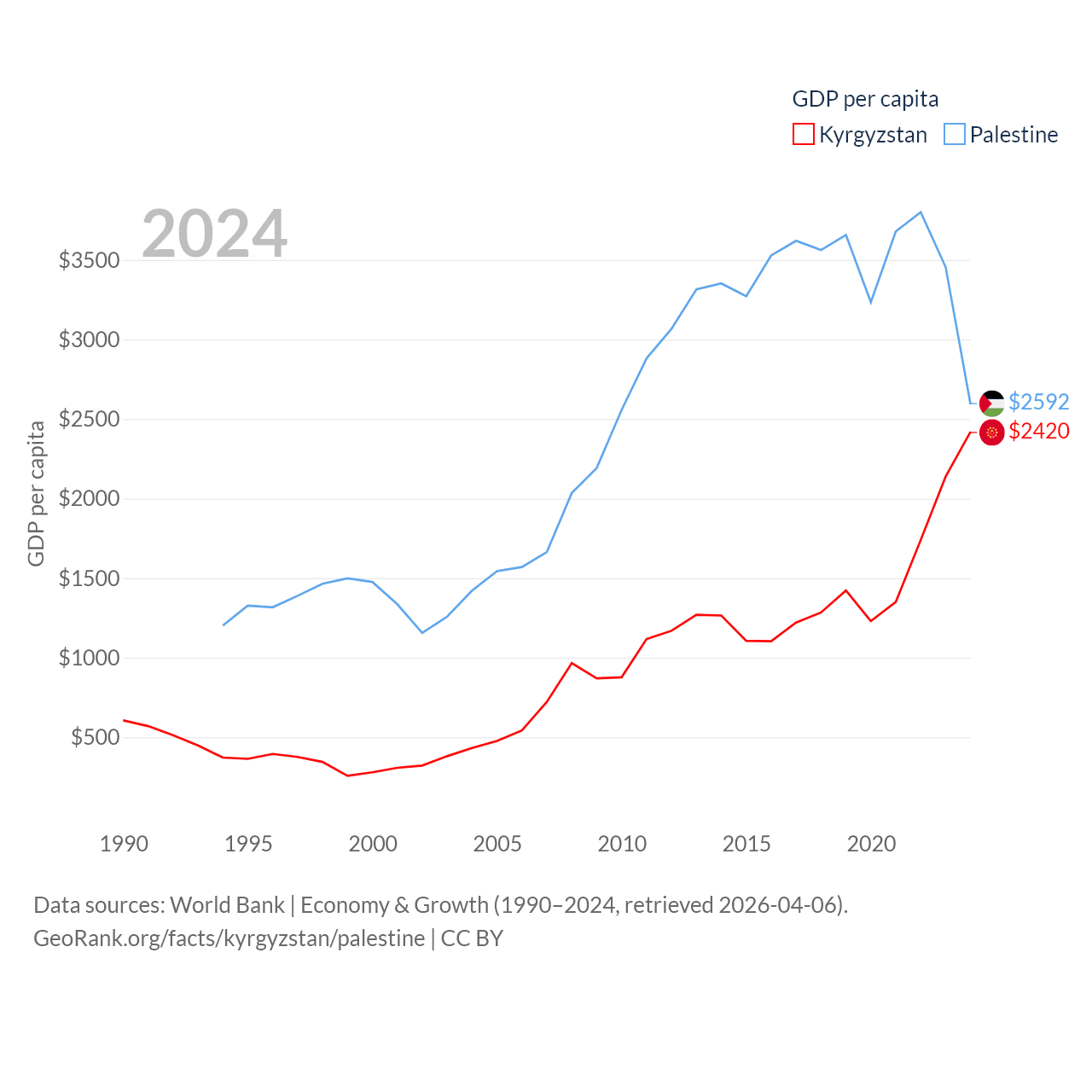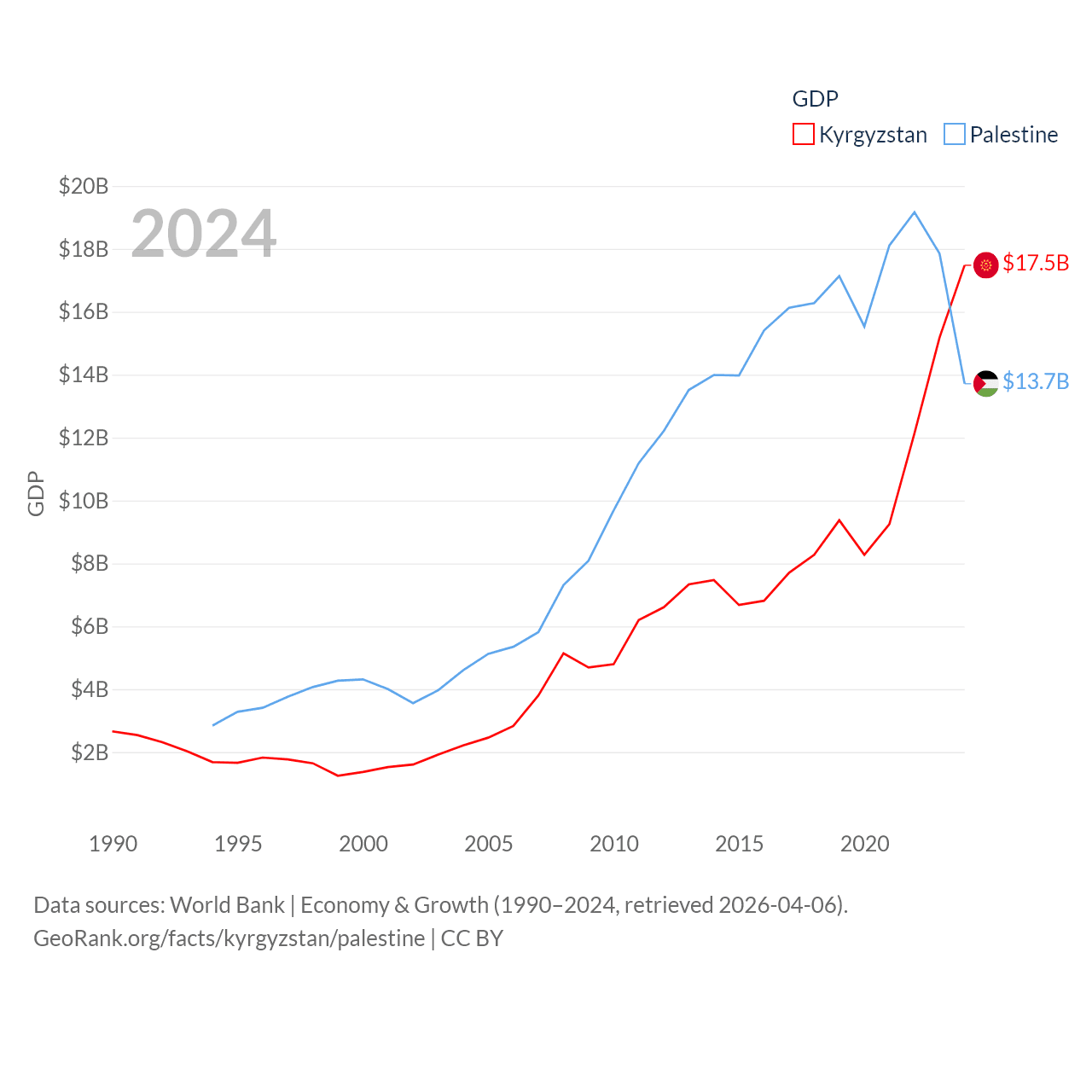 By GDP, Kyrgyzstan ranks 135/197 ($17.5B) and Palestine ranks 146/197 ($13.7B). By GDP per capita, Kyrgyzstan ranks 150/197 ($2,420), while Palestine ranks 147/197 ($2,592).