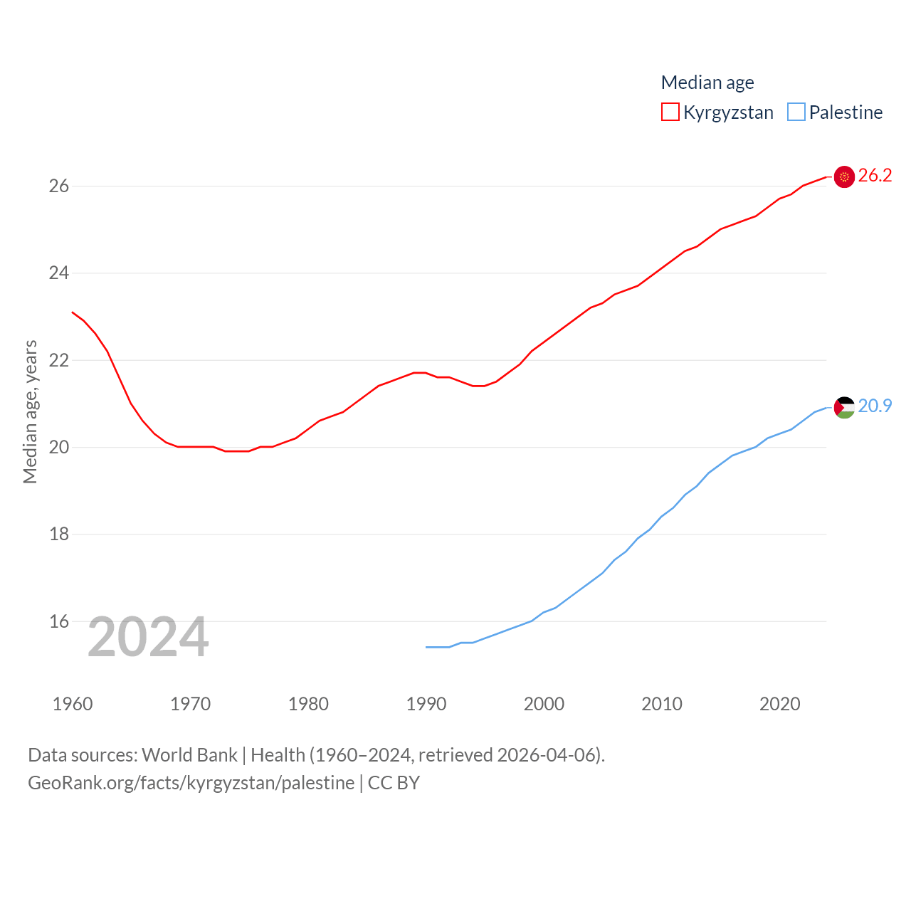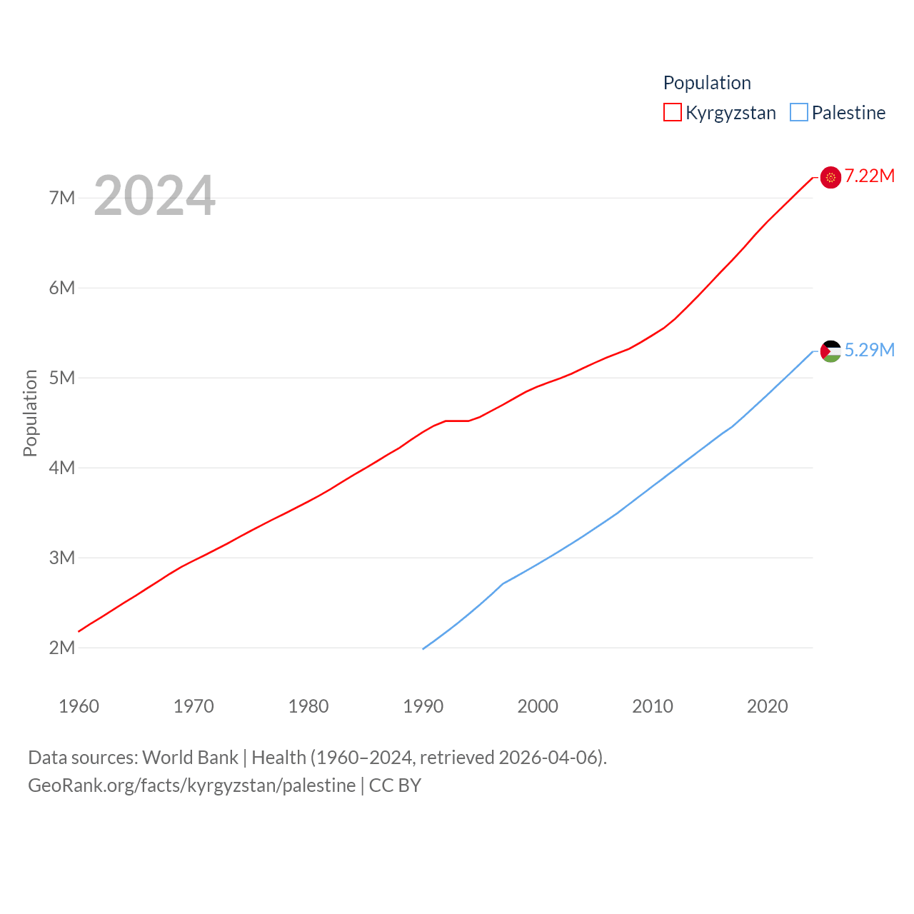 Kyrgyzstan has a population of 7.22M (ranked 106/197), compared with 5.29M in Palestine (ranked 122/197). Kyrgyzstan's land area is 74,054 sq mi versus 2,326 sq mi for Palestine (ranked 86th vs. 164th).