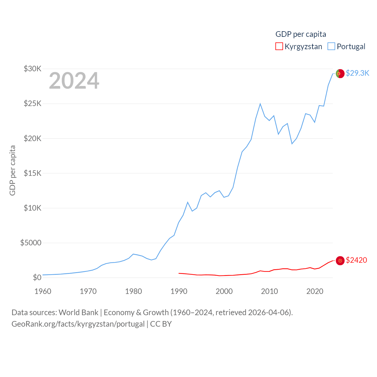 By GDP, Kyrgyzstan ranks 135/197 ($17.5B) and Portugal ranks 46/197 ($313B). By GDP per capita, Kyrgyzstan ranks 150/197 ($2,420), while Portugal ranks 44/197 ($29,292).