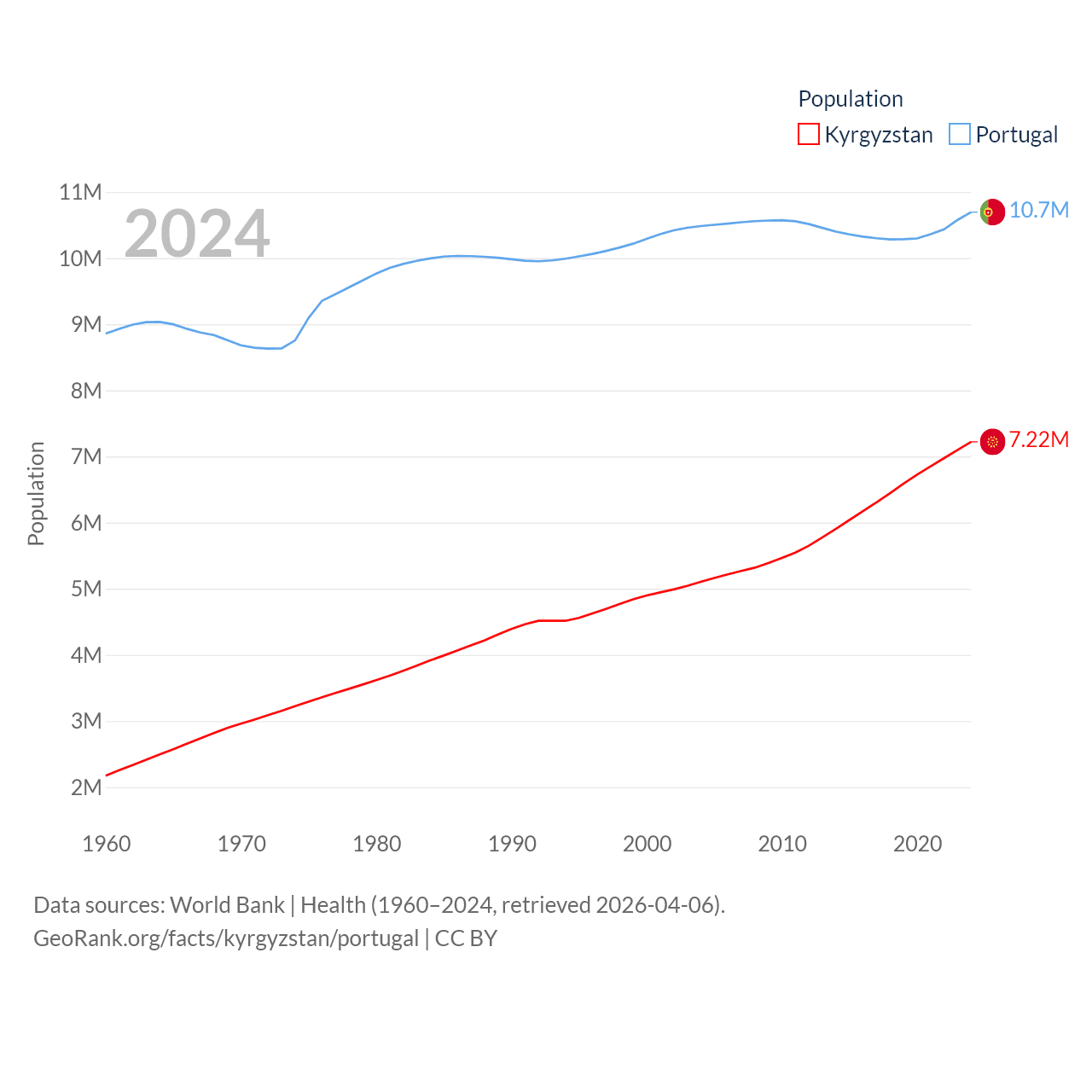 Kyrgyzstan has a population of 7.22M (ranked 106/197), compared with 10.7M in Portugal (ranked 90/197). Kyrgyzstan's land area is 74,054 sq mi versus 35,369 sq mi for Portugal (ranked 86th vs. 108th).