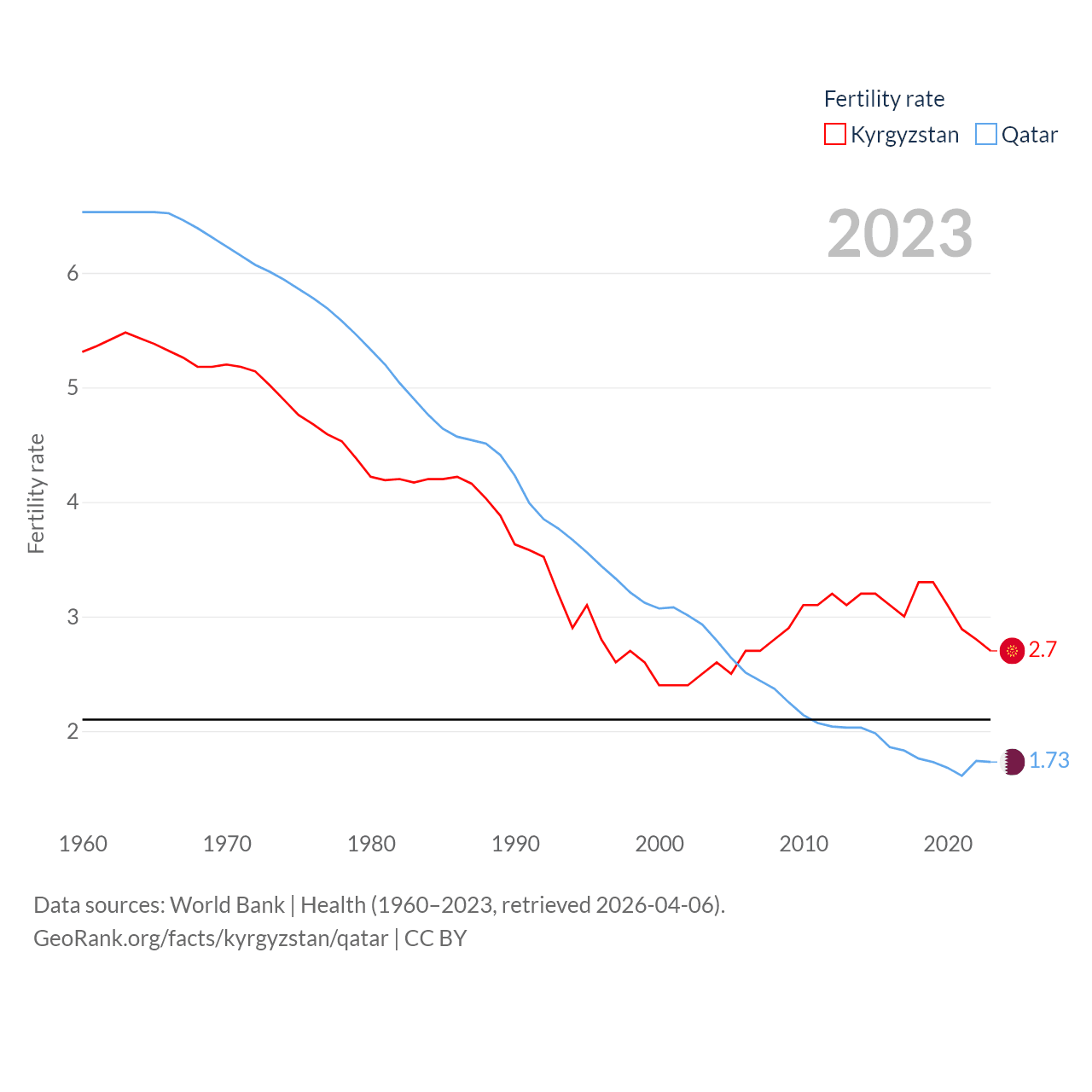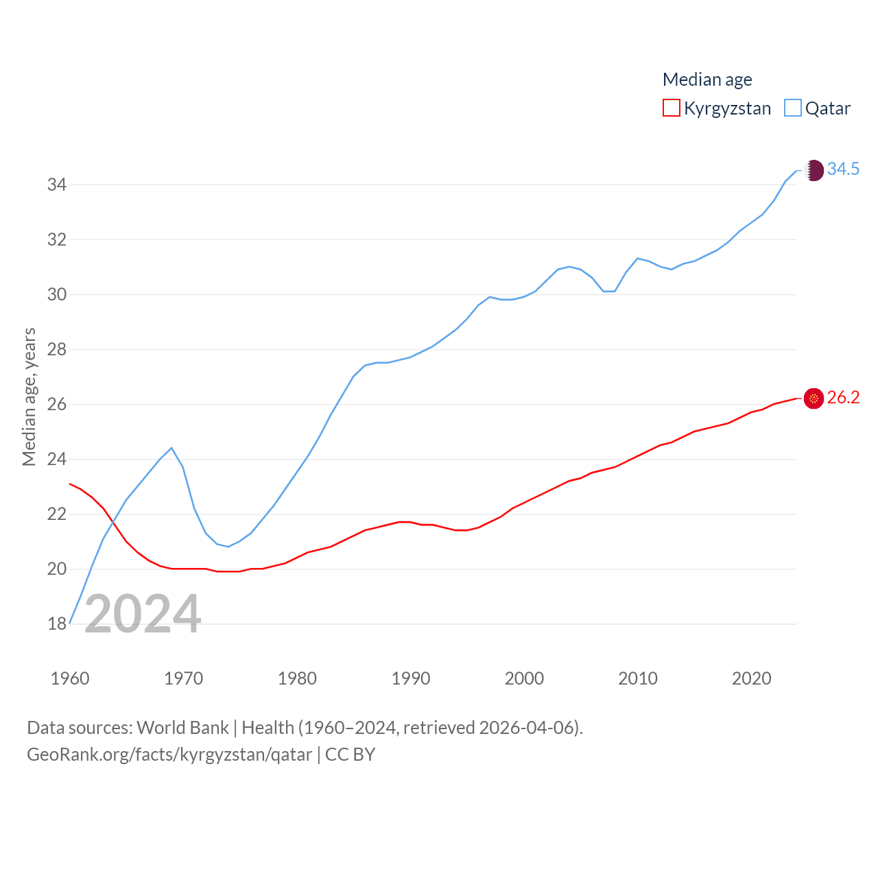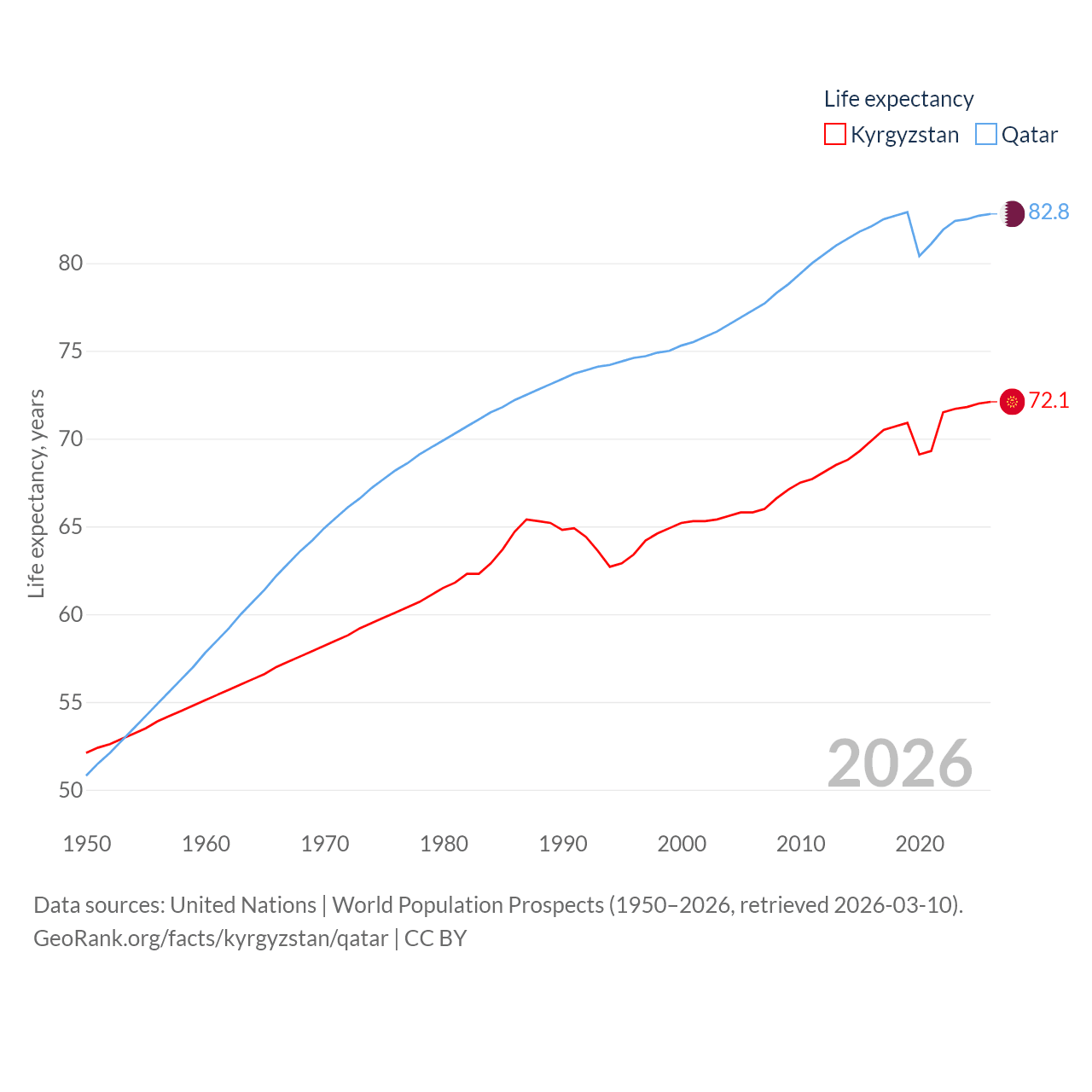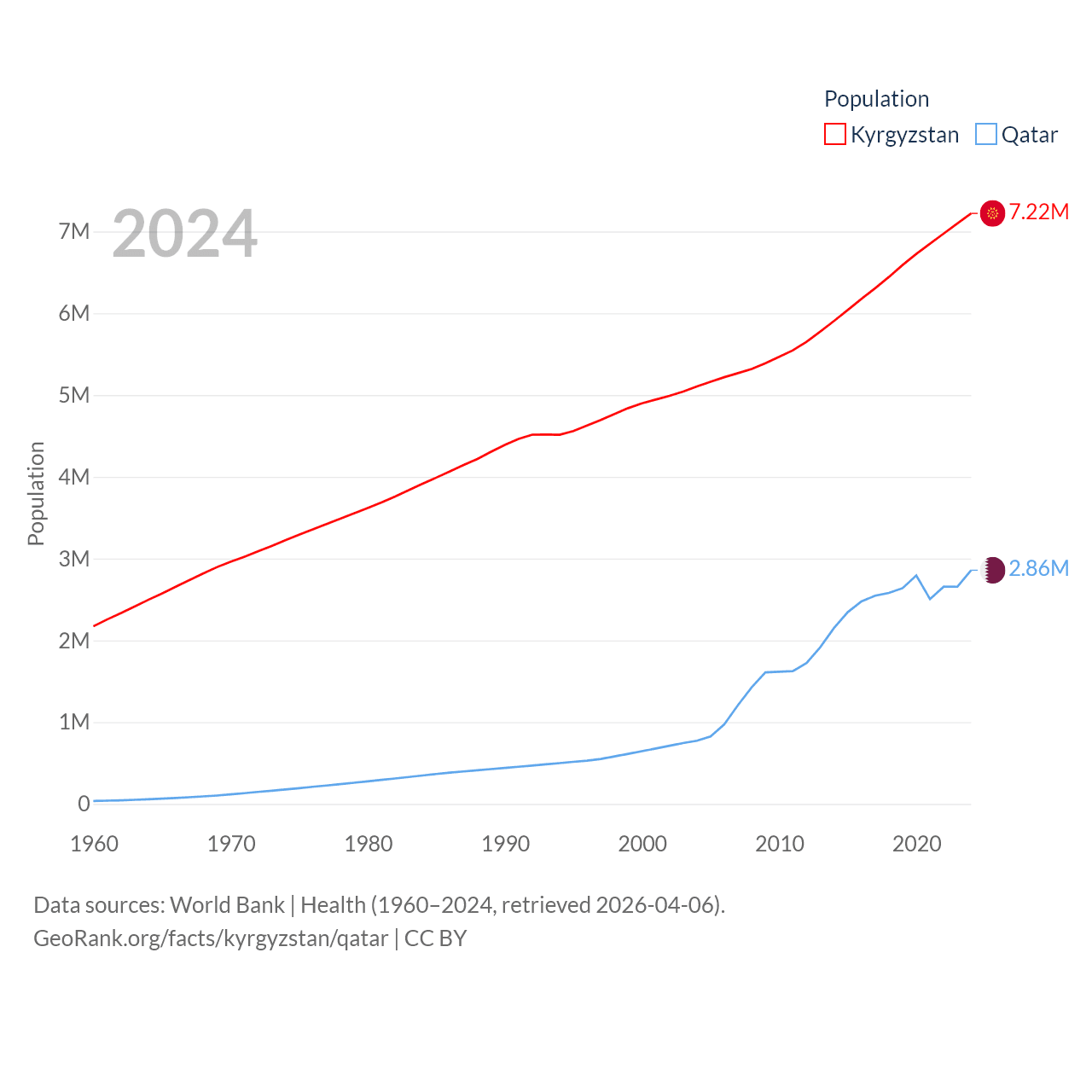 Kyrgyzstan has a population of 7.22M (ranked 106/197), compared with 2.86M in Qatar (ranked 138/197). Kyrgyzstan's land area is 74,054 sq mi versus 4,436 sq mi for Qatar (ranked 86th vs. 158th).