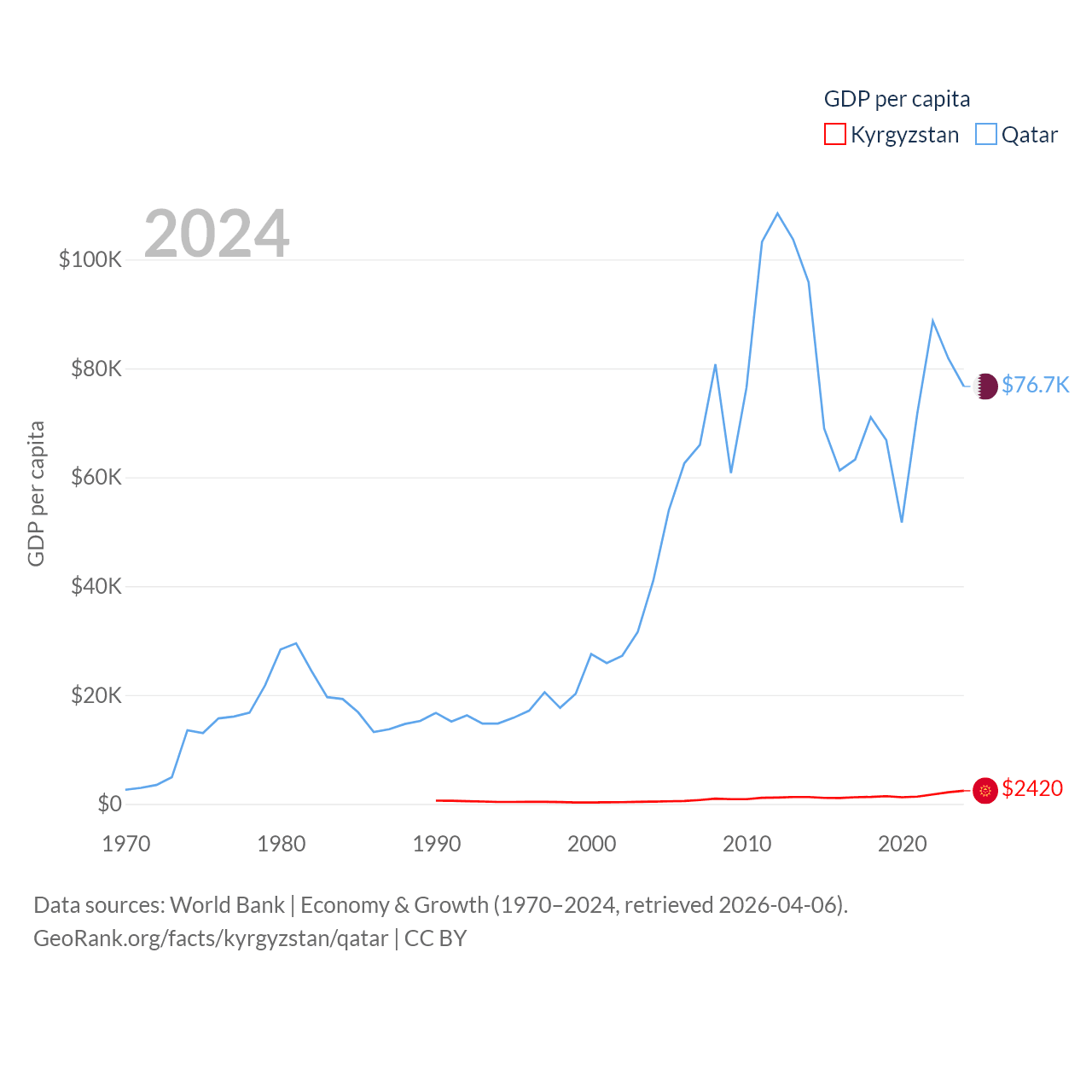 By GDP, Kyrgyzstan ranks 135/197 ($17.5B) and Qatar ranks 56/197 ($219B). By GDP per capita, Kyrgyzstan ranks 150/197 ($2,420), while Qatar ranks 11/197 ($76,689).