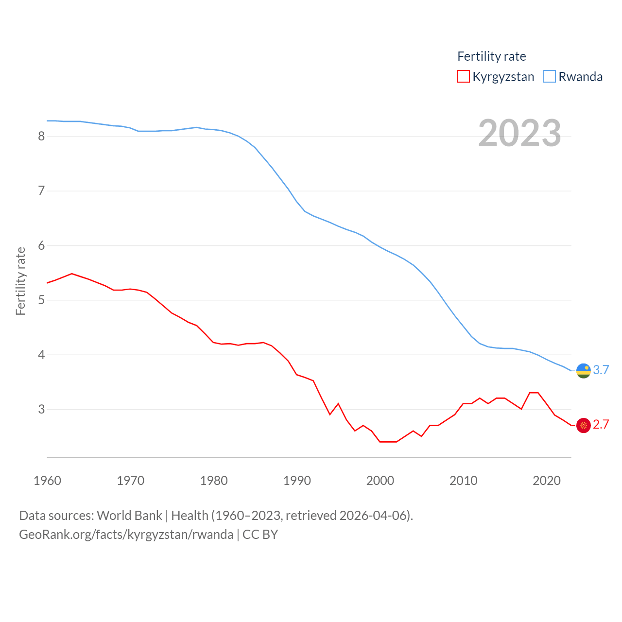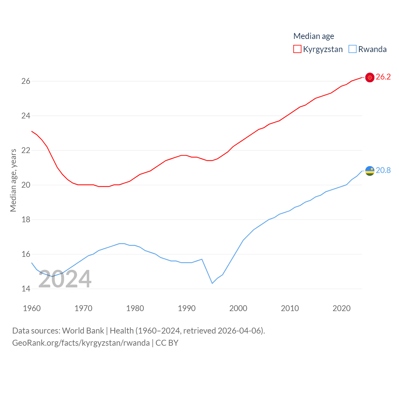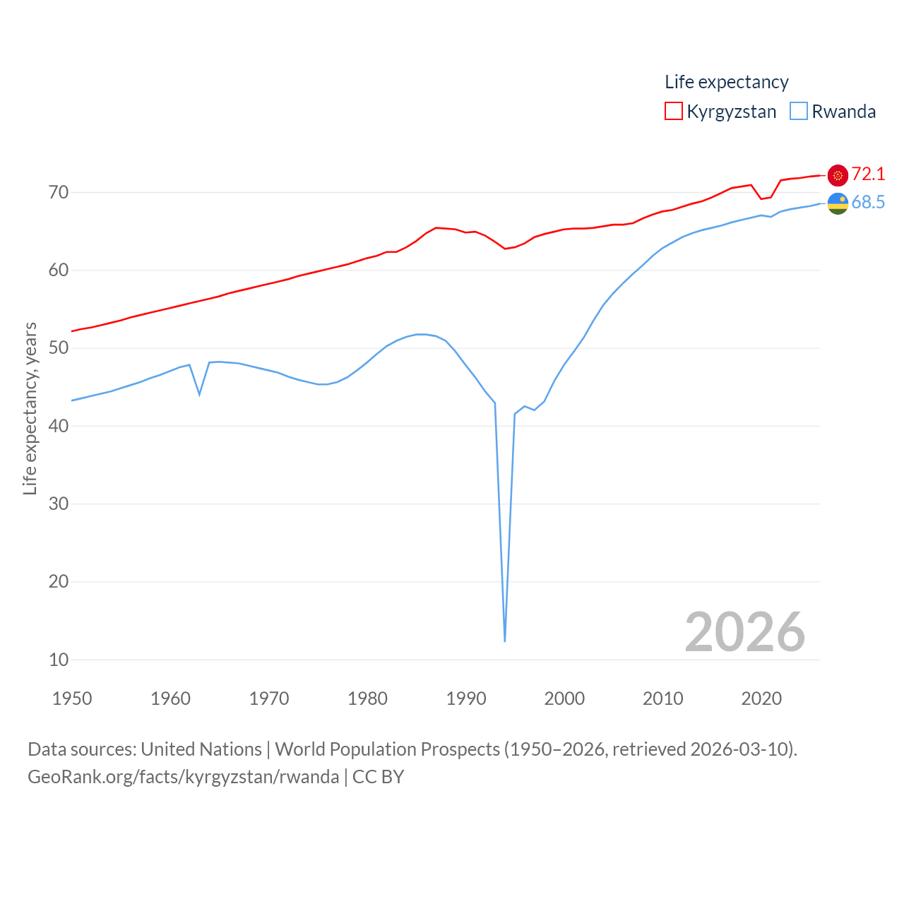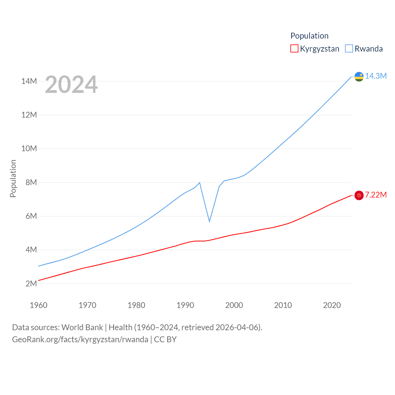 Kyrgyzstan has a population of 7.22M (ranked 106/197), compared with 14.3M in Rwanda (ranked 77/197). Kyrgyzstan's land area is 74,054 sq mi versus 9,525 sq mi for Rwanda (ranked 86th vs. 146th).