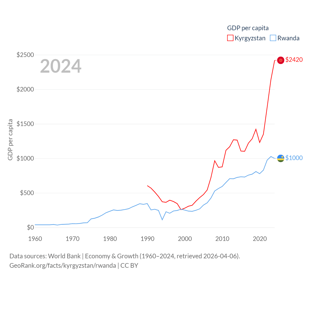 By GDP, Kyrgyzstan ranks 135/197 ($17.5B) and Rwanda ranks 144/197 ($14.3B). By GDP per capita, Kyrgyzstan ranks 150/197 ($2,420), while Rwanda ranks 178/197 ($1,000).