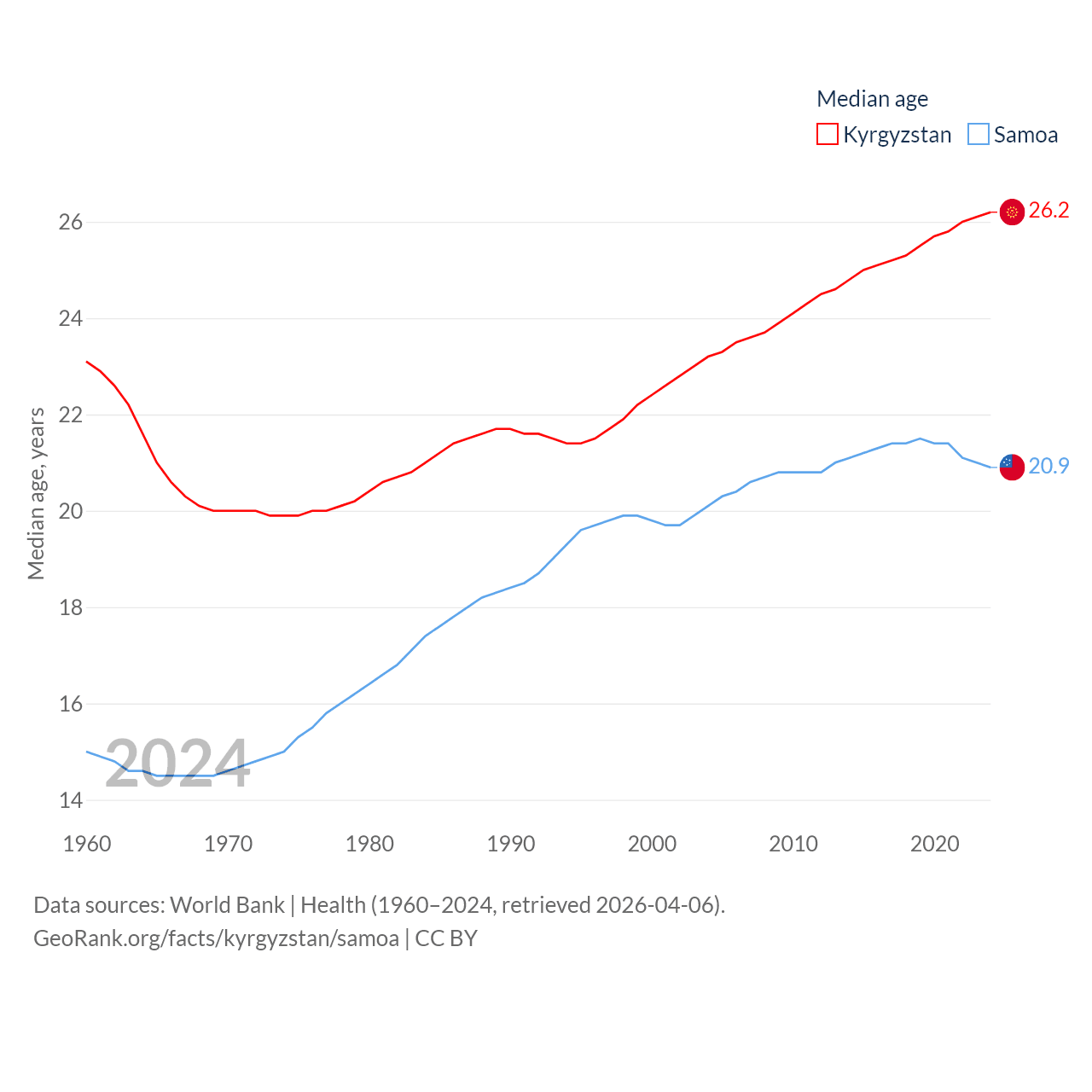 Kyrgyzstan has a population of 7.22M (ranked 106/197), compared with 218K in Samoa (ranked 177/197). Kyrgyzstan's land area is 74,054 sq mi versus 1,073 sq mi for Samoa (ranked 86th vs. 168th).