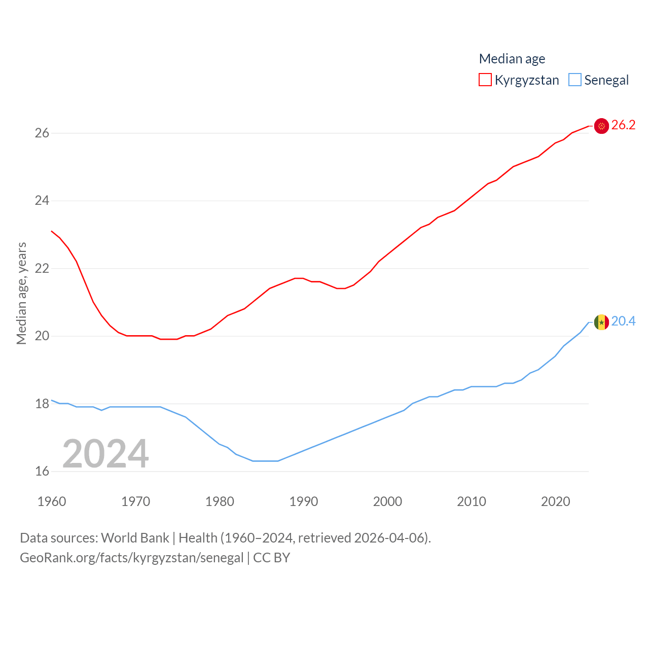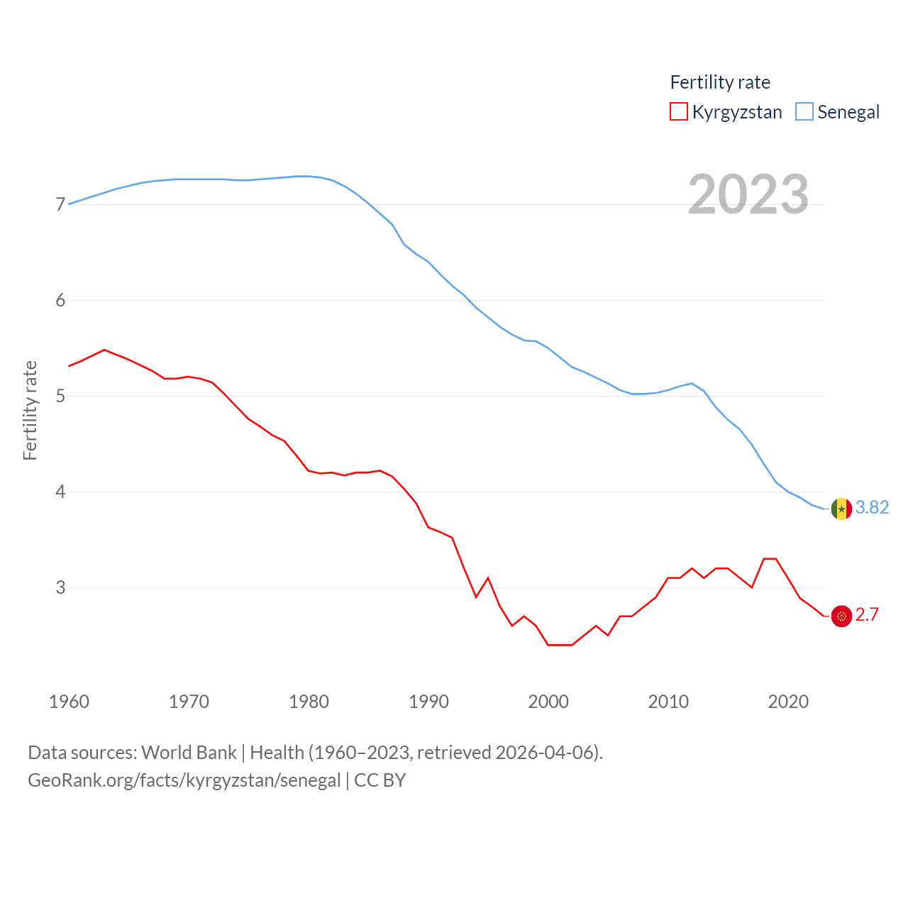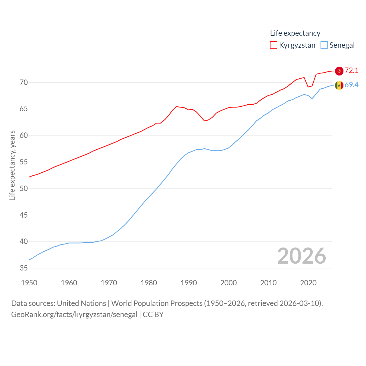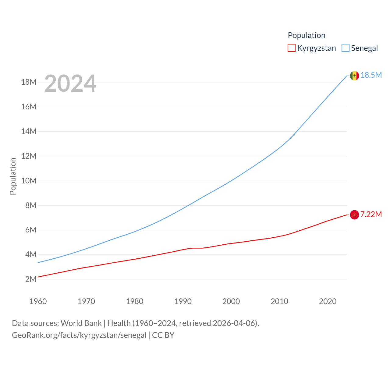 Kyrgyzstan has a population of 7.22M (ranked 106/197), compared with 18.5M in Senegal (ranked 69/197). Kyrgyzstan's land area is 74,054 sq mi versus 74,336 sq mi for Senegal (ranked 86th vs. 85th).