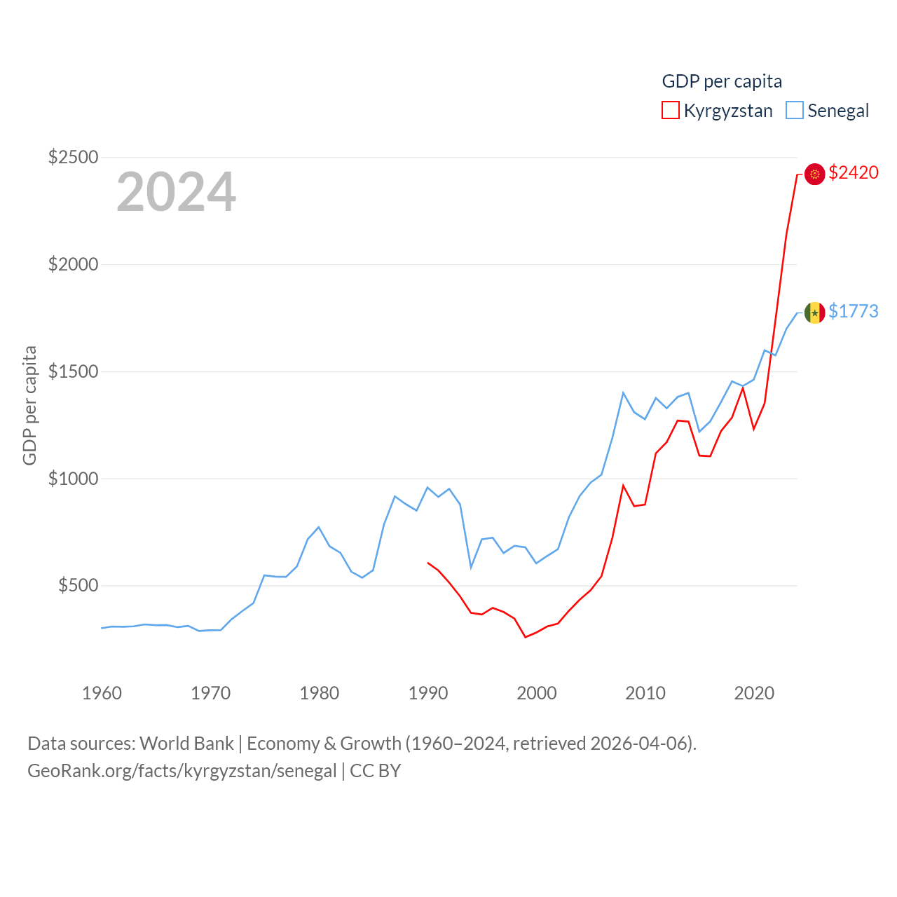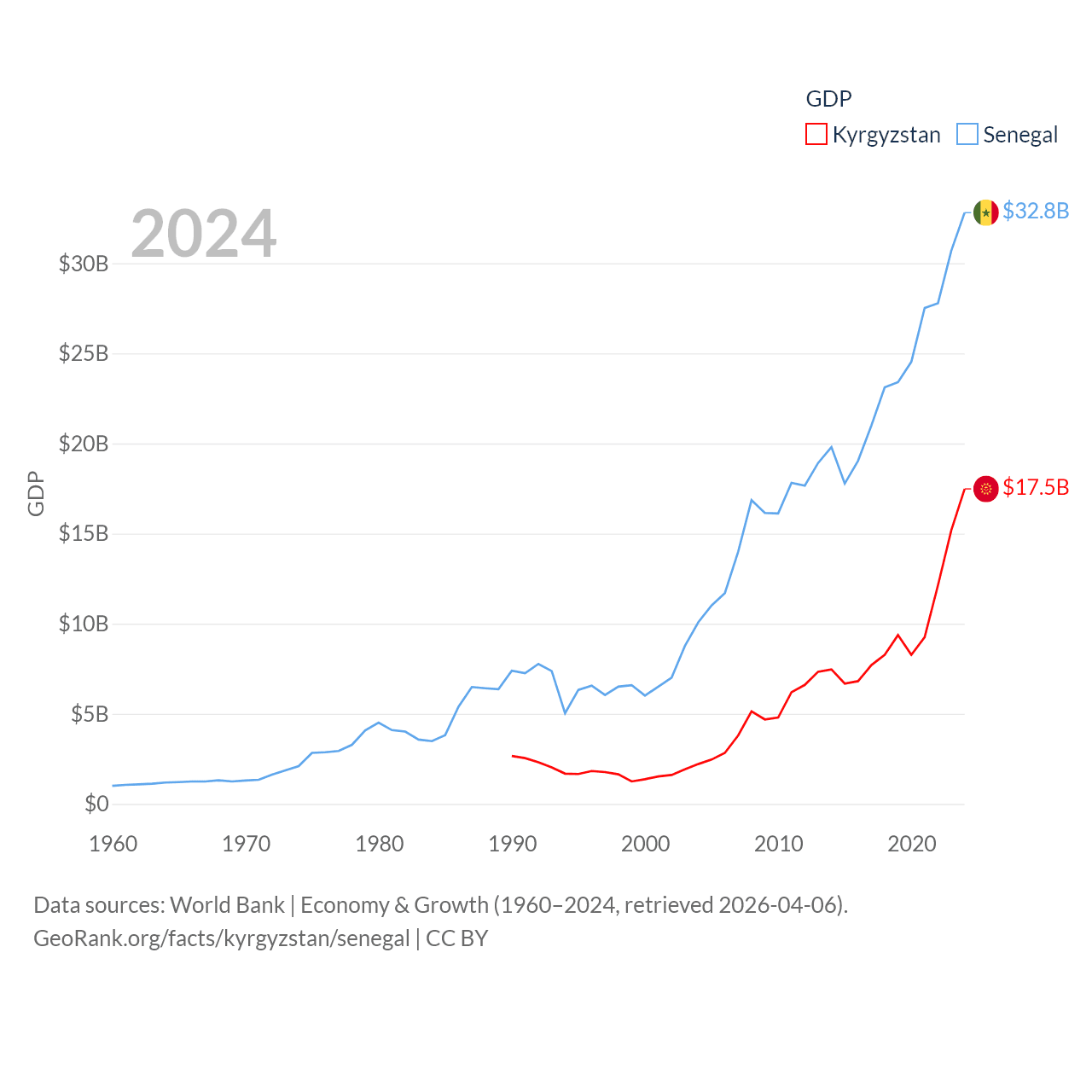 By GDP, Kyrgyzstan ranks 135/197 ($17.5B) and Senegal ranks 109/197 ($32.8B). By GDP per capita, Kyrgyzstan ranks 150/197 ($2,420), while Senegal ranks 159/197 ($1,773).