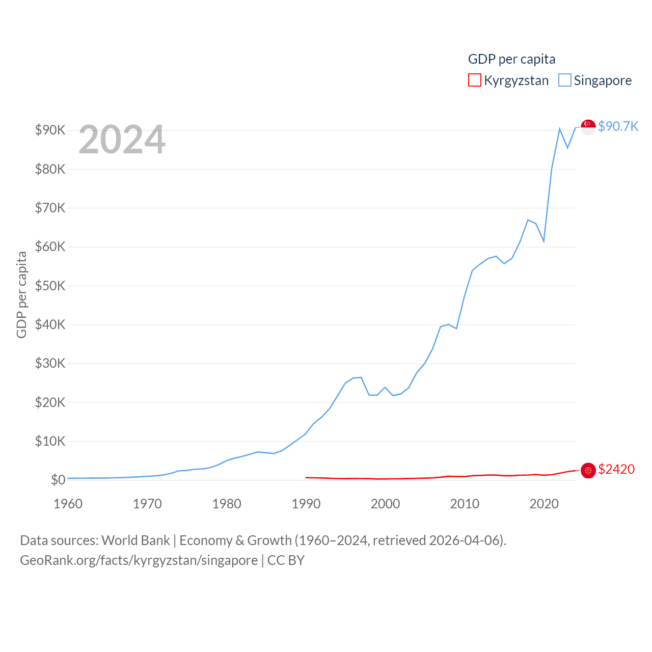 By GDP, Kyrgyzstan ranks 135/197 ($17.5B) and Singapore ranks 28/197 ($547B). By GDP per capita, Kyrgyzstan ranks 150/197 ($2,420), while Singapore ranks 7/197 ($90,674).