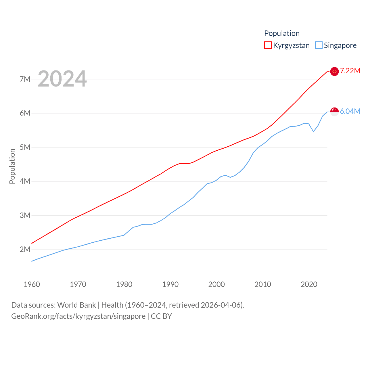 Kyrgyzstan has a population of 7.22M (ranked 106/197), compared with 6.04M in Singapore (ranked 113/197). Kyrgyzstan's land area is 74,054 sq mi versus 277.2 sq mi for Singapore (ranked 86th vs. 177th).