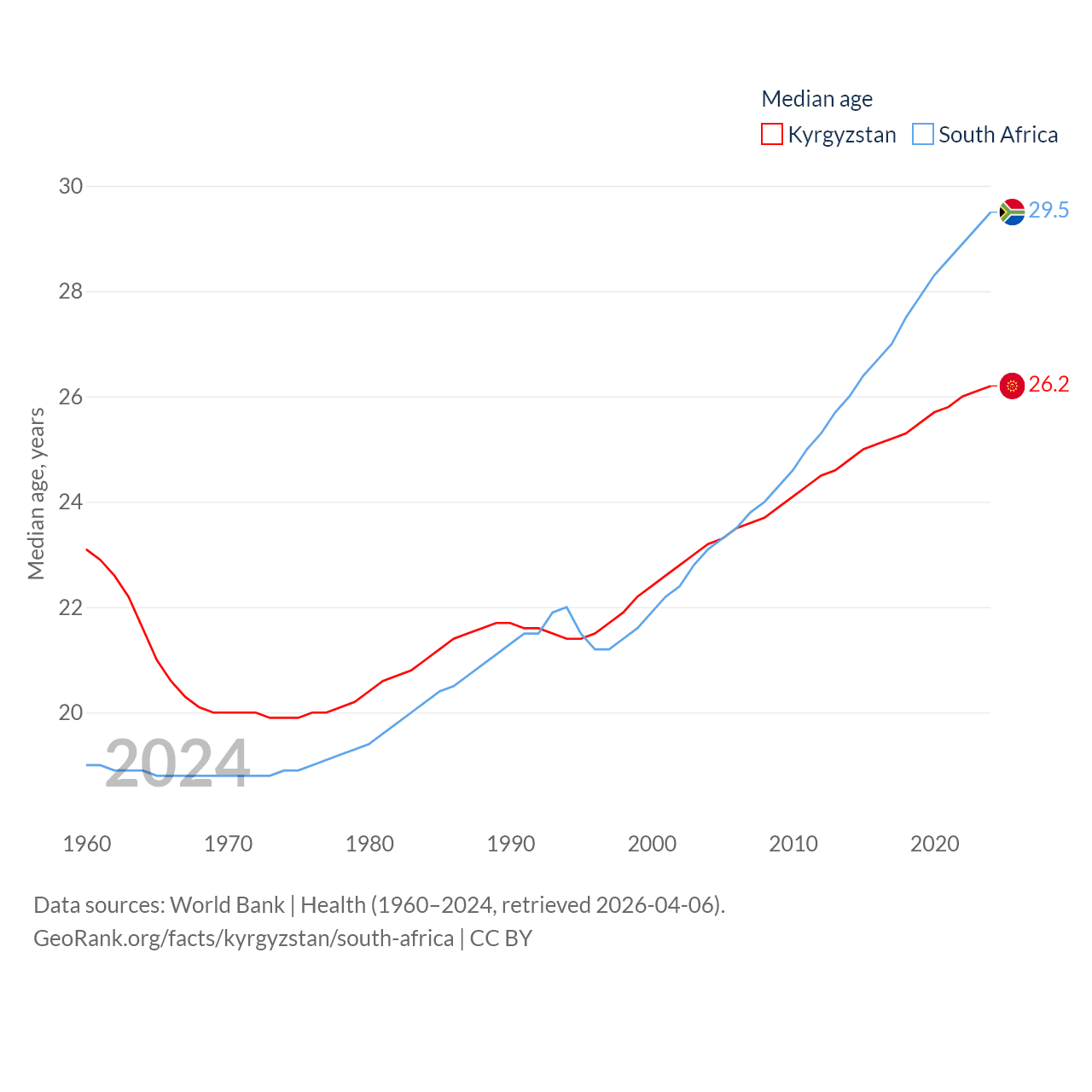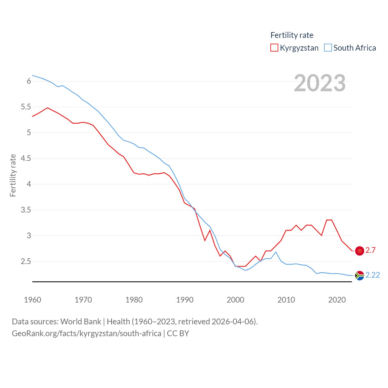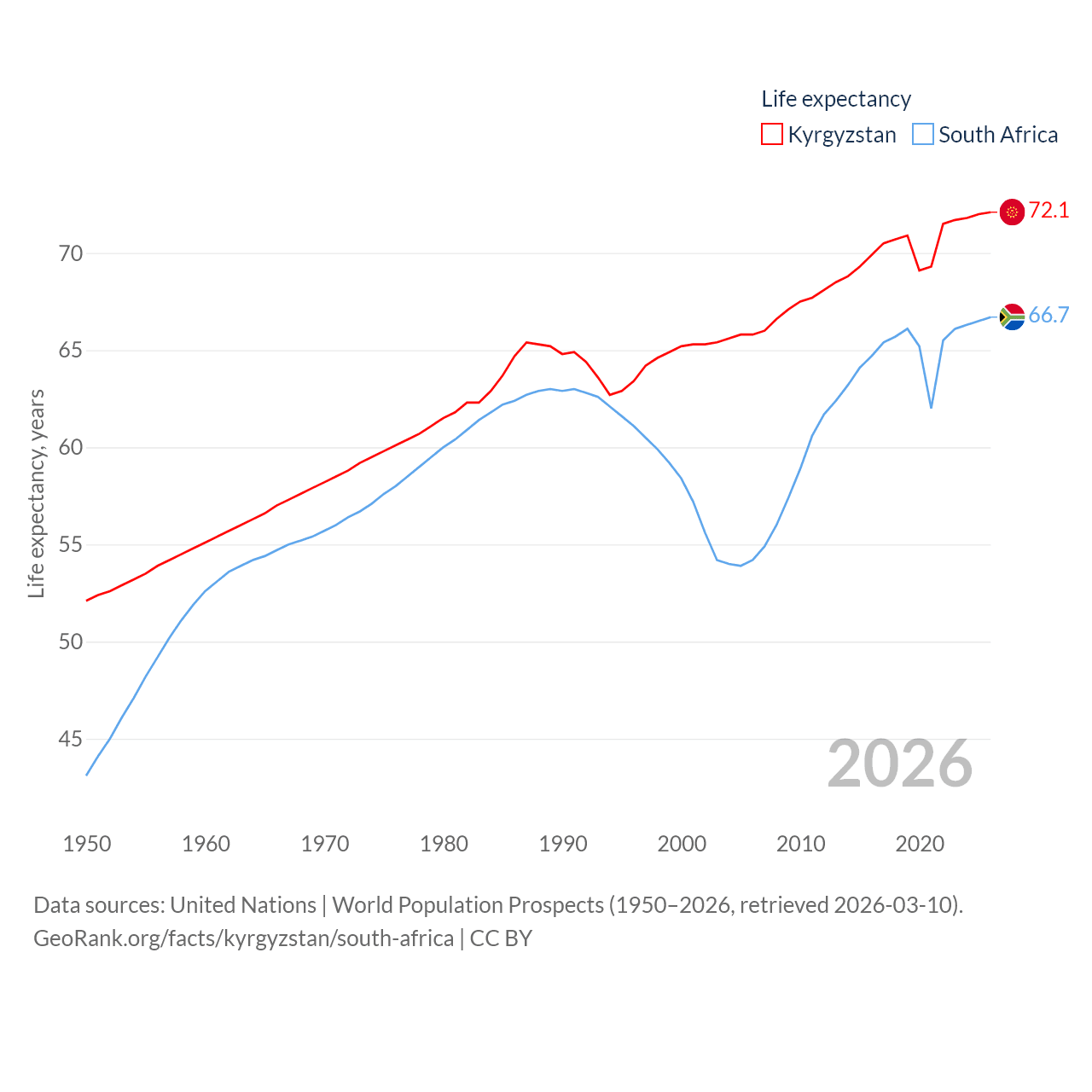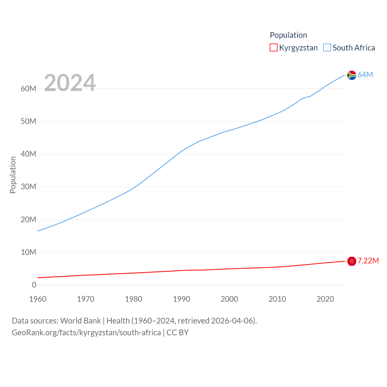 Kyrgyzstan has a population of 7.22M (ranked 106/197), compared with 64M in South Africa (ranked 24/197). Kyrgyzstan's land area is 74,054 sq mi versus 468,377 sq mi for South Africa (ranked 86th vs. 24th).